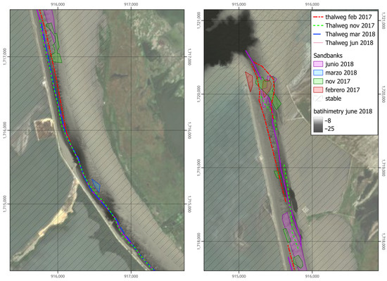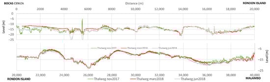 The objective of these campaigns was to record the conditions of the river during high, low, and medium water periods, respectively. However, in 2017, the flow did not exceed its average value, remaining almost constant throughout the wet season until its decline at the end of January. The average flow during these months was 7000 m3/s, which allowed for stable bathymetry for that flow. In March, the flow reached its minimum and began to rise almost immediately, reaching 7000 m3/s again in July.