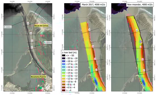 Immediately upstream of Bocas de Ceniza and the newly designed meander lies the Bocatoma del Puerto reach. The channel in this area exhibits geometric characteristics very similar to those of the new alignment, as the latter was designed by maintaining channel widths and radii of curvature equivalent to those observed at Bocatoma del Puerto (see Figure 22). Therefore, it was considered appropriate to replicate the bed morphology of the Bocatoma del Puerto bend in the Bocas de Ceniza area, thereby obtaining a representation of the bed of the new meander based on measured field data, without the need for numerical modeling.