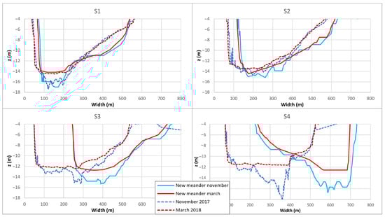 Figure 21 also includes a comparison of the channel configuration before and after the implementation of the new meander under low-flow conditions, which represent the most critical scenario for river navigability.