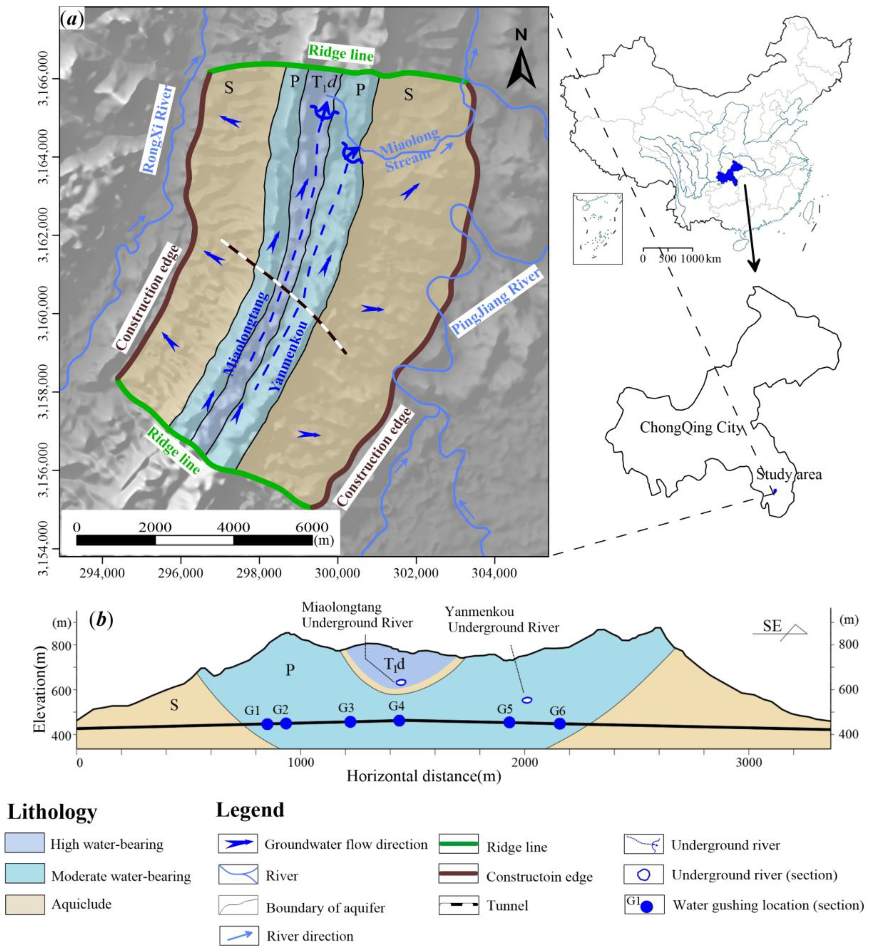 - Zhang, N.; Zheng, Q.; Elbaz, K.; Xu, Y.S. Water Inrush Hazards in the Chaoyang Tunnel, Guizhou, China: A Preliminary Investigation. Water 2020, 12, 1083. [Google Scholar] [CrossRef]
