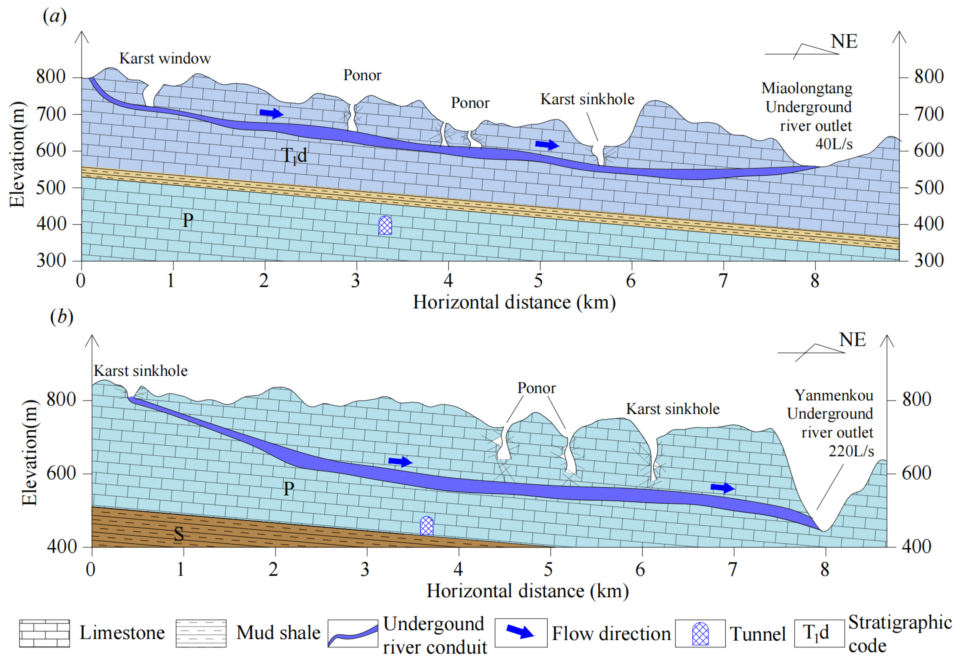 - Song, X.Q.; Cen, C.; Liu, K.; Zhang, C.; Zhou, A.G.; Wang, Y.; Peng, Q.; Na, J. Numerical Simulation Analysis of the Impact of Tunnel Construction on Aquifers in the Karst Regions of Southwestern China. Water 2025, 17, 619. [Google Scholar] [CrossRef]