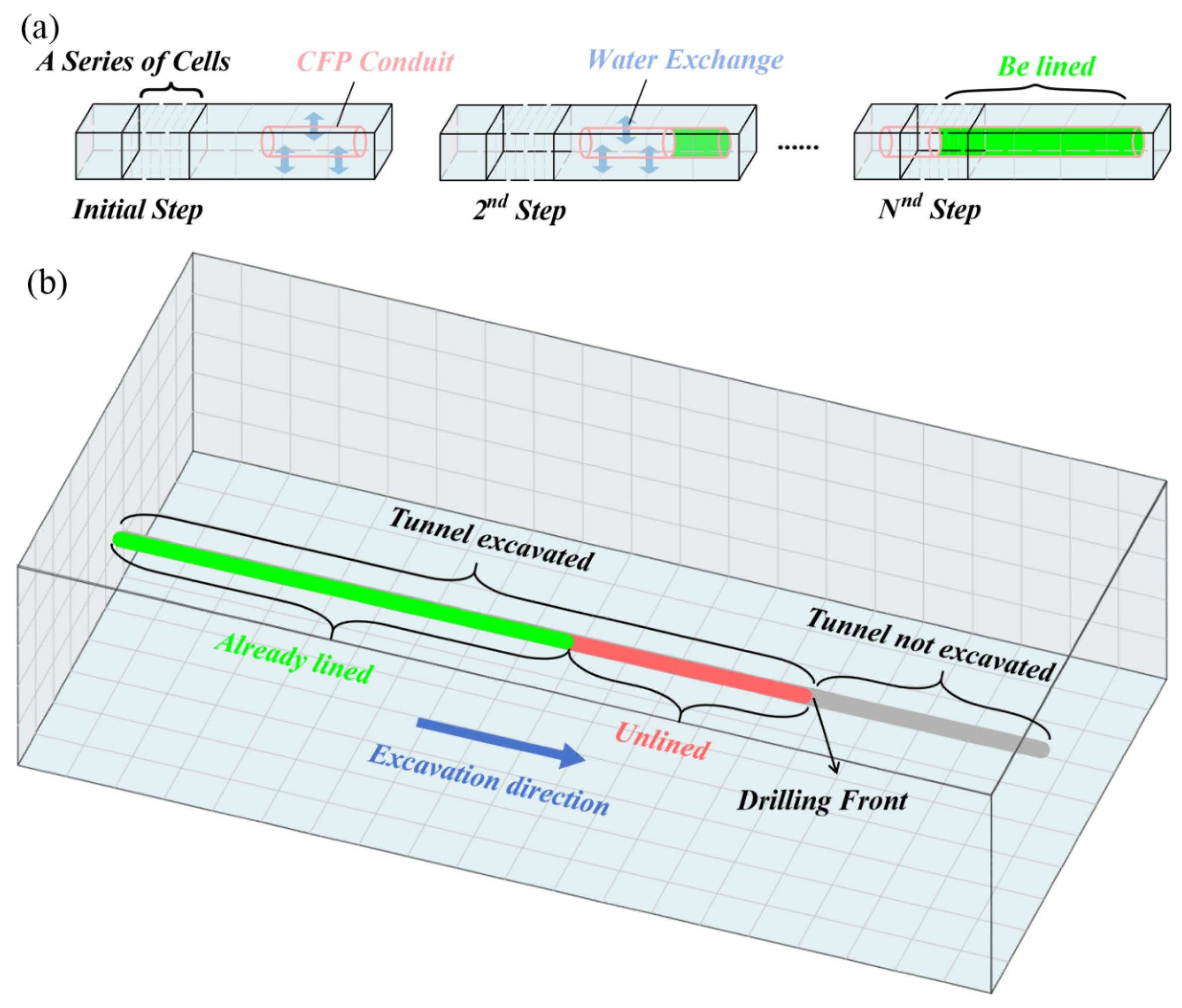 - Xia, Q.; Xu, M.; Zhang, H.; Zhang, Q.; Xiao, X.X. A dynamic modeling approach to simulate groundwater discharges into a tunnel from typical heterogenous geological media during continuing excavation. Ksce J. Civ. Eng. 2018, 22, 341–350. [Google Scholar] [CrossRef]