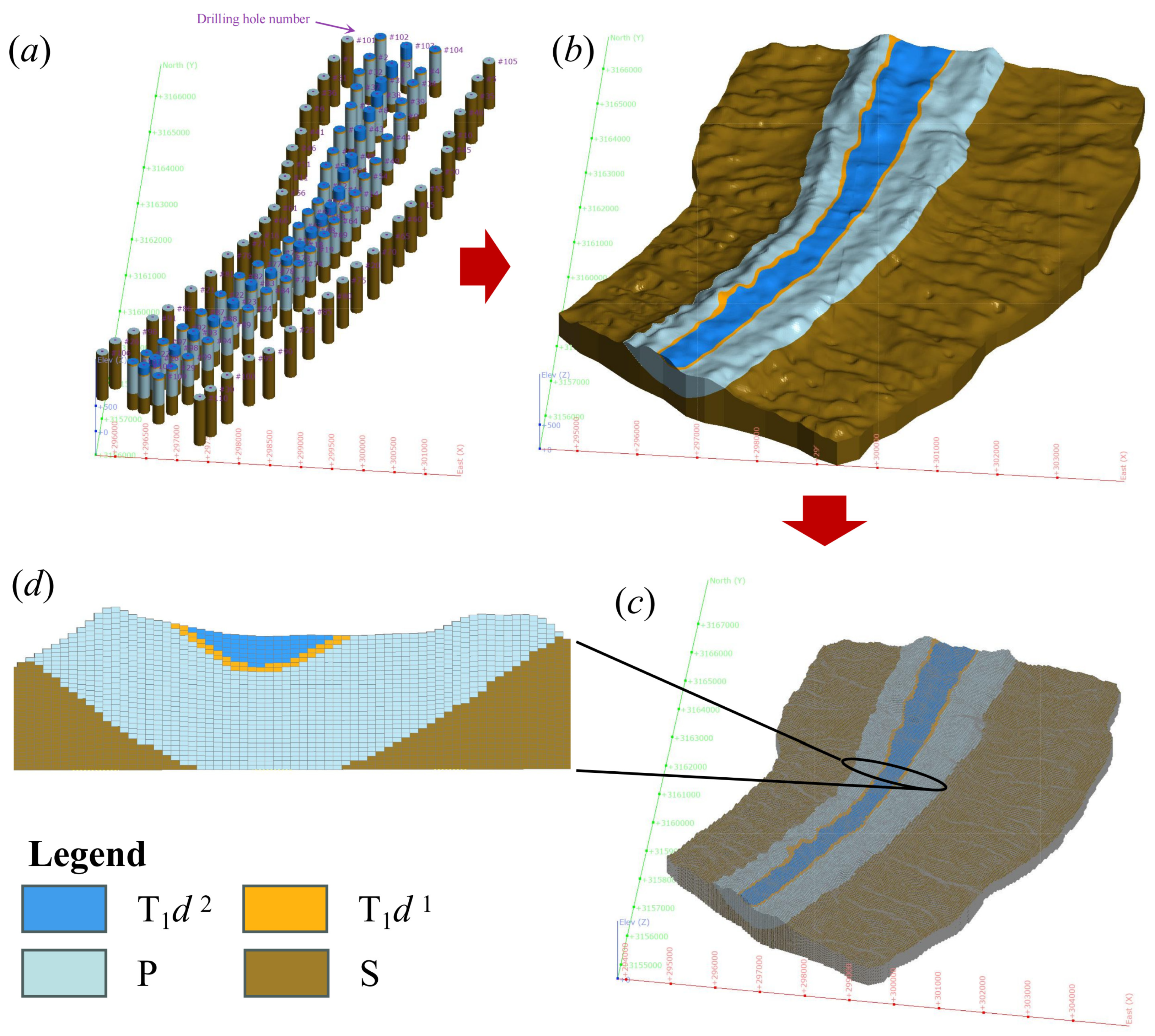 - Calcagno, P.; Chilès, J.P.; Courrioux, G.; Guillen, A. Geological modelling from field data and geological knowledge Part I. Modelling method coupling 3D potential-field interpolation and geological rules. Phys. Earth Planet. Inter. 2008, 171, 147–157. [Google Scholar] [CrossRef]