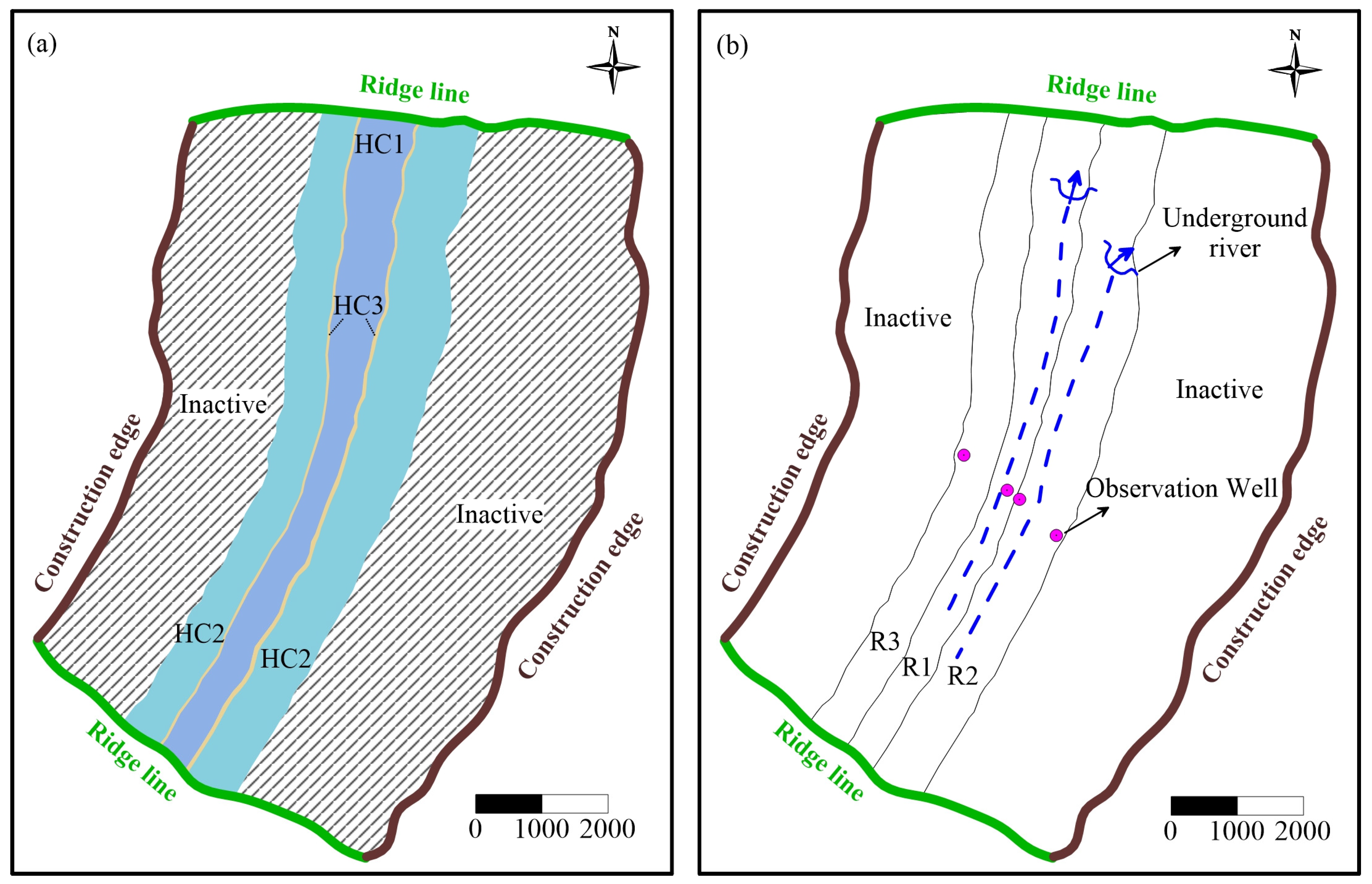 - Bottom boundary: Since the lowest altitude of the deeply incised rivers around the syncline is 250 m, an altitude of 200 m is used as the bottom boundary of the hydrogeological model. Below this depth, karst development is poor and has little influence on the model, so it is regarded as an impermeable boundary.