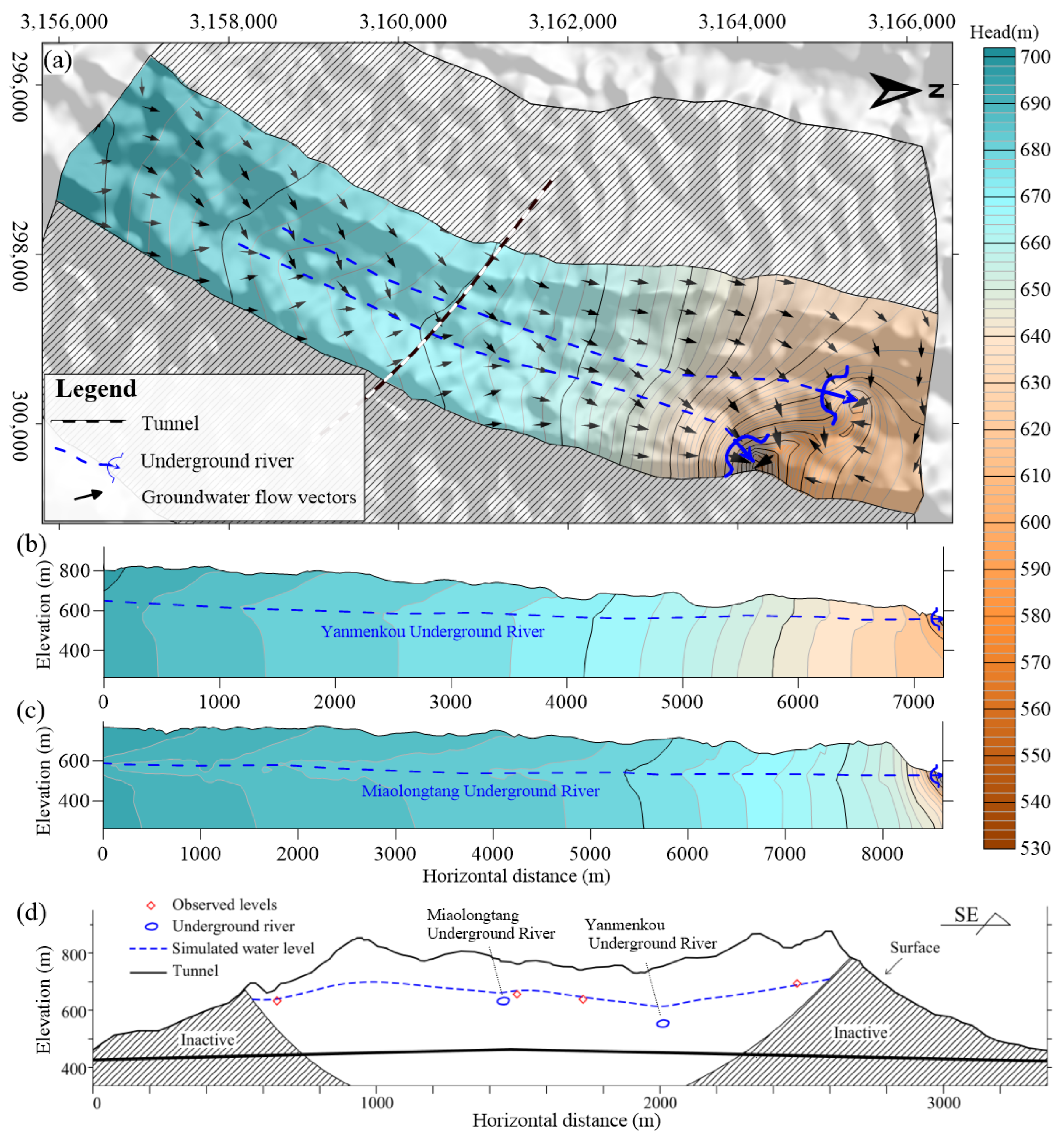 - Zheng, X.K.; Yang, Z.B.; Wang, S.; Chen, Y.F.; Hu, R.; Zhao, X.J.; Wu, X.L.; Yang, X.L. Evaluation of hydrogeological impact of tunnel engineering in a karst aquifer by coupled discrete-continuum numerical simulations. J. Hydrol. 2021, 597, 125765. [Google Scholar] [CrossRef]
