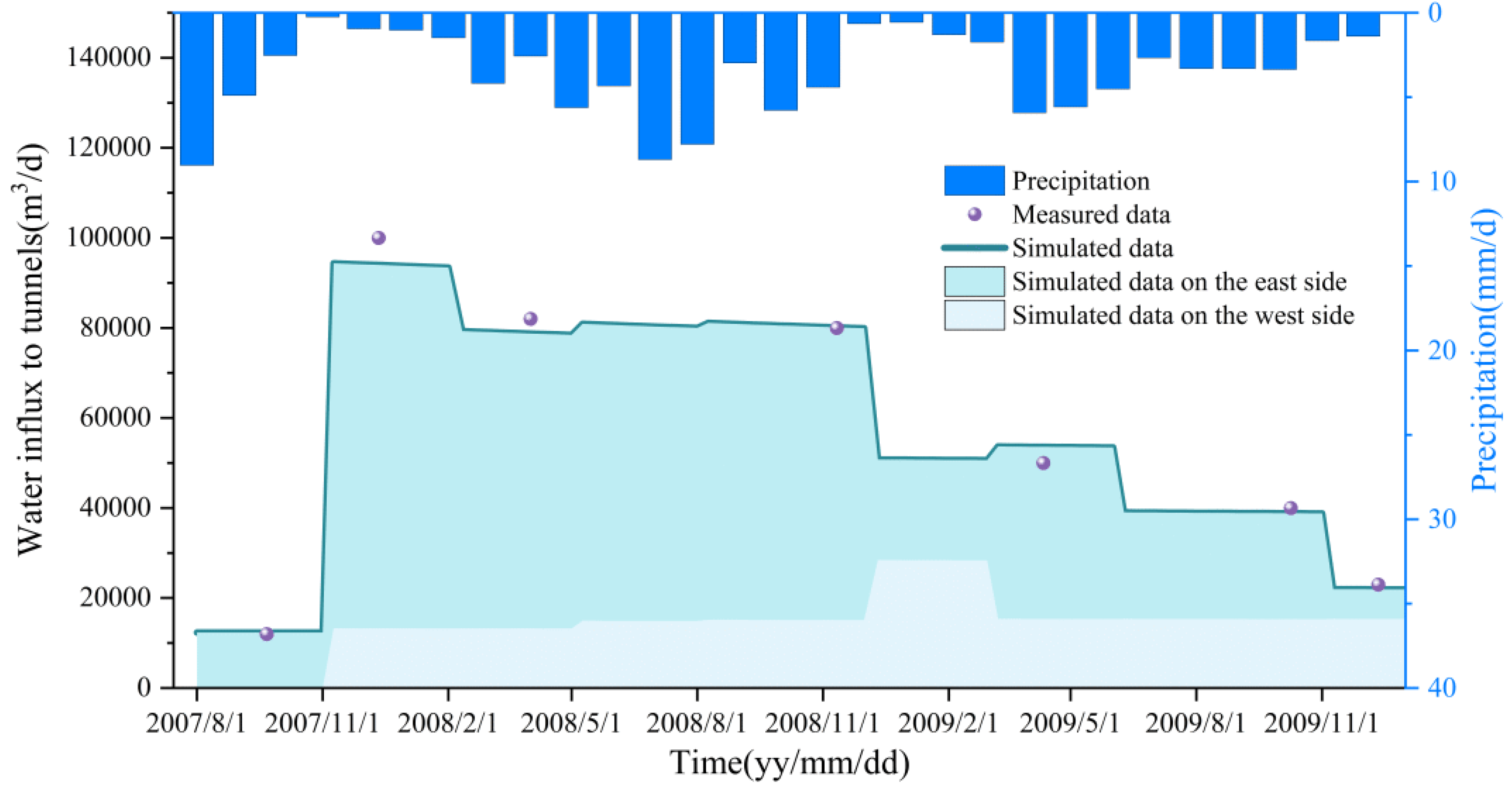 - Zhu, R.; Xia, Q.; Zhang, Q.; Cao, C.; Zhang, X.Y.; Mao, B.Y. Dynamic Parameter Calibration of an Analytical Model to Predict Transient Groundwater Inflow into a Tunnel. Water 2023, 15, 2702. [Google Scholar] [CrossRef]