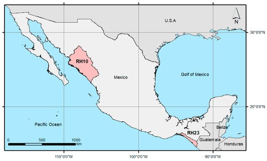 Geographic location of the two study regions in Mexico: Hydrological Region RH10 (Sinaloa) and Hydrological Region RH23 (Chiapas Coast). The figure provides the regional context of the analysis within the national territory; map scale and north arrow are included for reference.