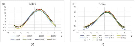 Andrews curves constructed from morphometric and climatological attributes. Clustering supports hydrological homogeneity of the study region. (a) RH10 (A, MAP, DD)—adapted from [6]; (b) RH23 (Em, MAP, DD, A).
