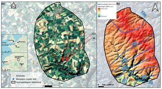 (a) Location of the Limesy hydrogeological watershed, including the Becquigny supply well (blue), 129 mapped sinkholes (orange), and the two tracer-confirmed sinkholes (95 and 122) hydraulically connected to the supply well (red). (b) Groundwater table elevation (m a.s.l.) based on mean piezometric contours of the Chalk aquifer (2001–2006; BRGM Atlas, 2010), with DEM elevation derived from LiDAR measurements provided by IGN (m a.s.l.).
