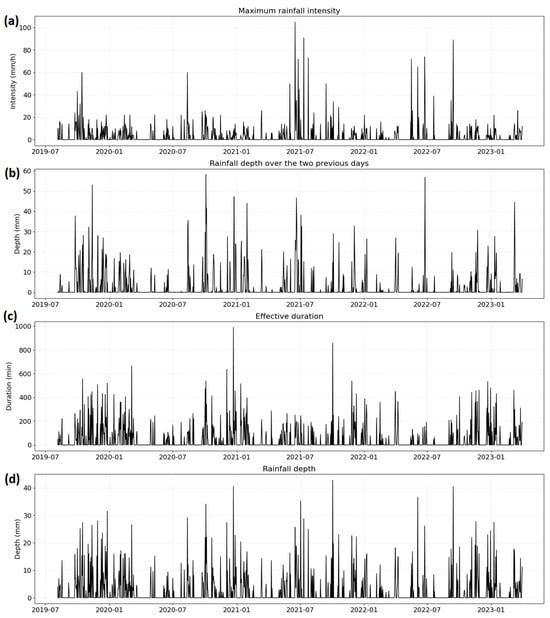 Hydroclimatic time series used as inputs to the WaterSed model and the deep learning models over the study period (2019–2023); (a) maximum rainfall intensity (mm·h−1), (b) cumulative rainfall depth over the two preceding days (mm), (c) effective rainfall duration (min), and (d) daily rainfall depth (mm).