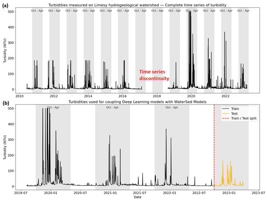 (a) Reconstructed daily turbidity (NTU) measured at the Becquigny supply well over the 2010 to 2023 period. (b) Reconstructed daily turbidity (NTU) extracted after the time-series discontinuity and used for coupling deep learning models with WaterSed simulations.