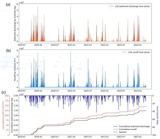 The outputs of the WaterSed model consist of raster datasets produced at the scale of the hydrogeological catchment. Spatial raster of runoff and sediment discharge are generated for each rainfall event. These variables are then extracted at the locations of the 129 identified sinkholes (see Figure 1). Because the activity of individual sinkholes is temporally variable and runoff pathways may evolve over time, we adopt the working hypothesis that runoff and sediment fluxes entering a sinkhole are conserved downstream at the catchment scale. Figure 5 presents the time series of sediment discharge (Figure 5a) and runoff (Figure 5b) aggregated over the 129 sinkholes, as well as their cumulative values over the study period (Figure 5c).