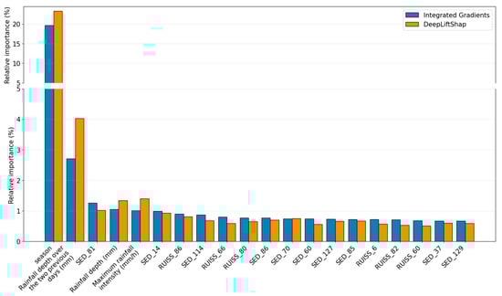 In Figure 8, global feature importance was estimated by aggregating the absolute attribution values obtained with Integrated Gradients and DeepLiftShap. Although differences in relative importance are observed for secondary features, both methods show consistent dominant trends. This consistency indicates that the identification of the main controlling variables is not strongly sensitive to the choice of attribution method, supporting the robustness of the interpretation. Global importance results show that turbidity is primarily controlled by seasonal forcing and short-term rainfall accumulation (2 days before), while sediment discharge and runoff from multiple sinkholes contribute jointly at lower individual levels.