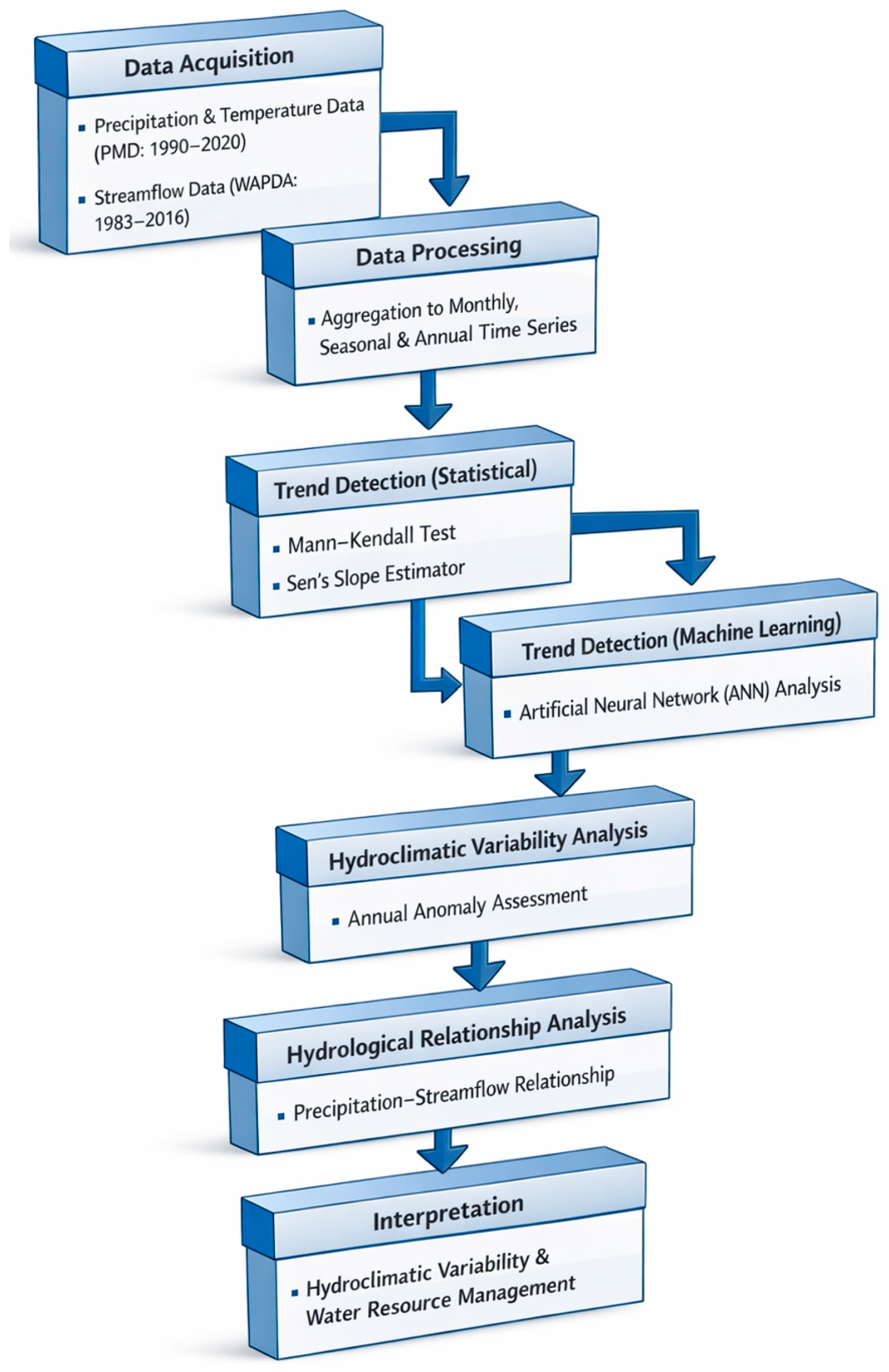 The present study used the MK test and an ANN model to assess trends in precipitation, temperature, and streamflow in the Soan River Basin. Combining statistical and machine-learning models allows for the detection of both monotonic and non-linear temporal variability, which is vital for explaining hydroclimatic change in complicated river basins [