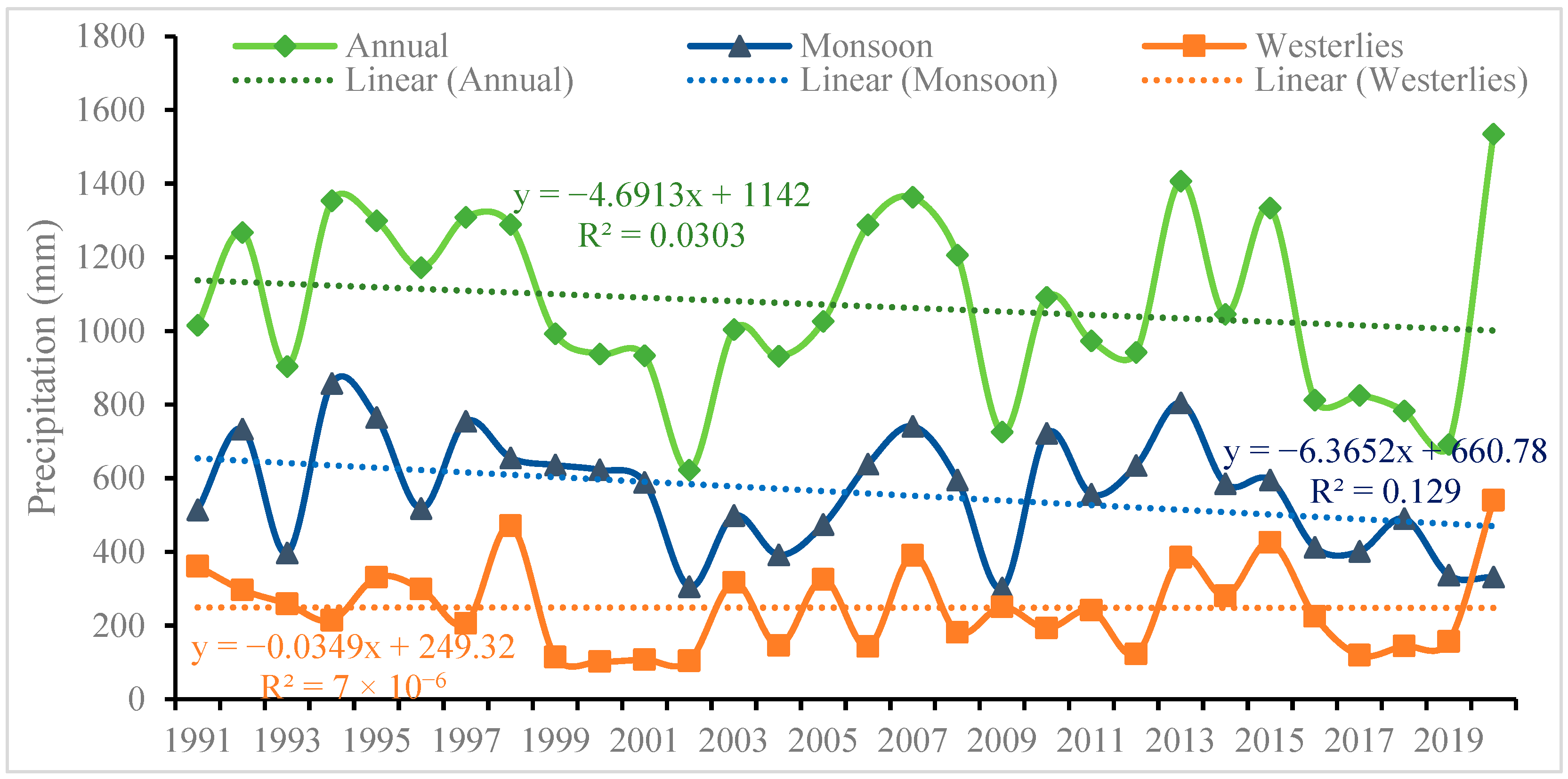 Figure 5 presents the changes in the annual, monsoon, and westerly precipitation of the Soan River Basin during the years 1991–2020. The average annual precipitation fluctuates wildly every year, with the years 1996 to 1999 and 2003 to 2007 being wet and dry, respectively. The linear trend shows that annual precipitation has reduced slightly during the study time.