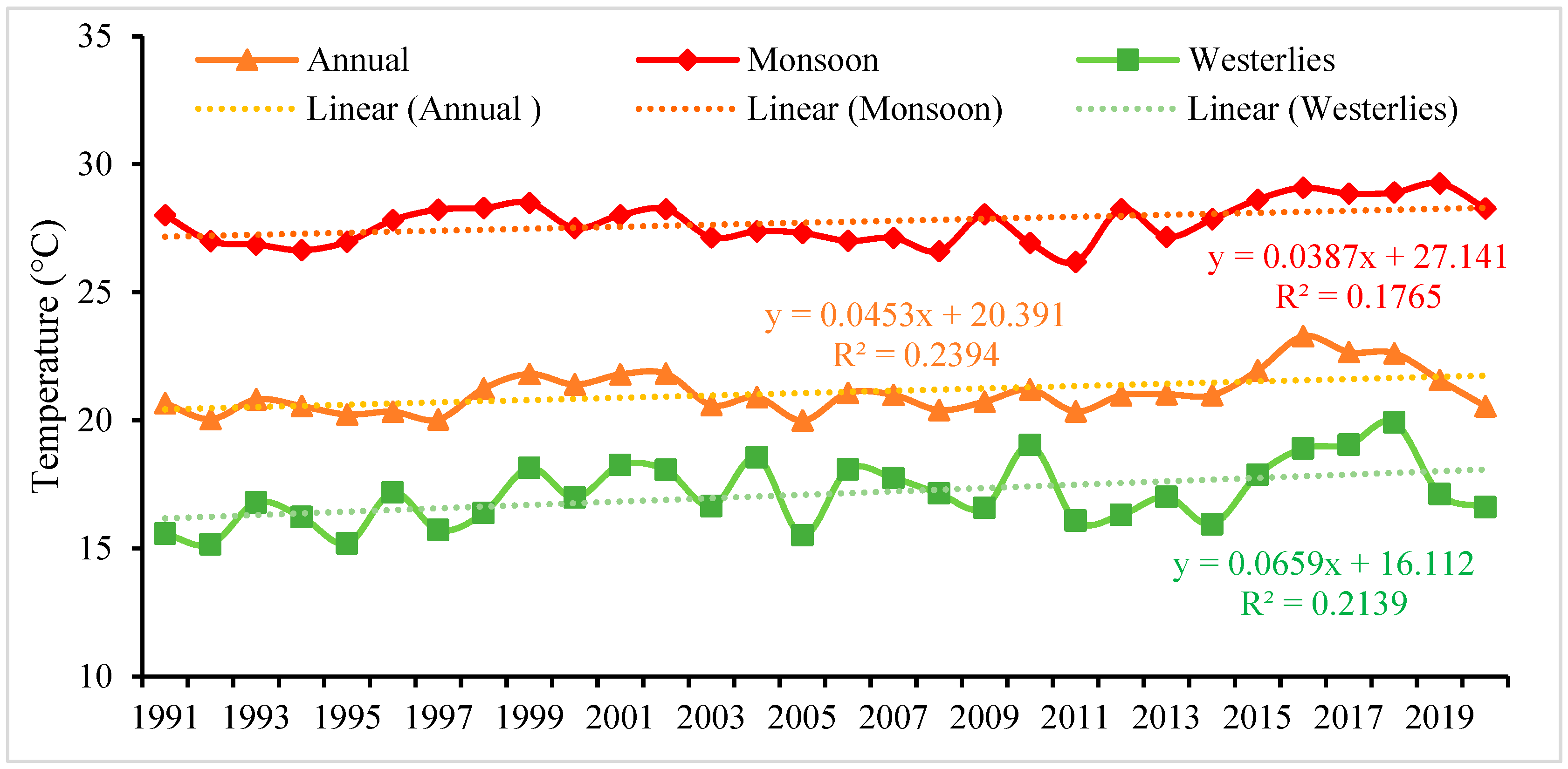 Figure 9c) temperature anomalies, albeit at varied magnitudes and time scales. Temperature anomalies in the monsoon seasons exhibit intermediate interannual variability, with cooler conditions predominant throughout the earlier study period and steadily increasing warmer anomalies after 2010. The westerly season anomalies exhibit bigger amplitude variations, with the initial cold anomalies appearing in the early 1990s and a steady shift toward warmer climates observed in subsequent years. Both moving average curves of the two seasons show an apparent warming regime for the period following 2015, while the linear trends demonstrate that seasonal temperatures are continuously rising.