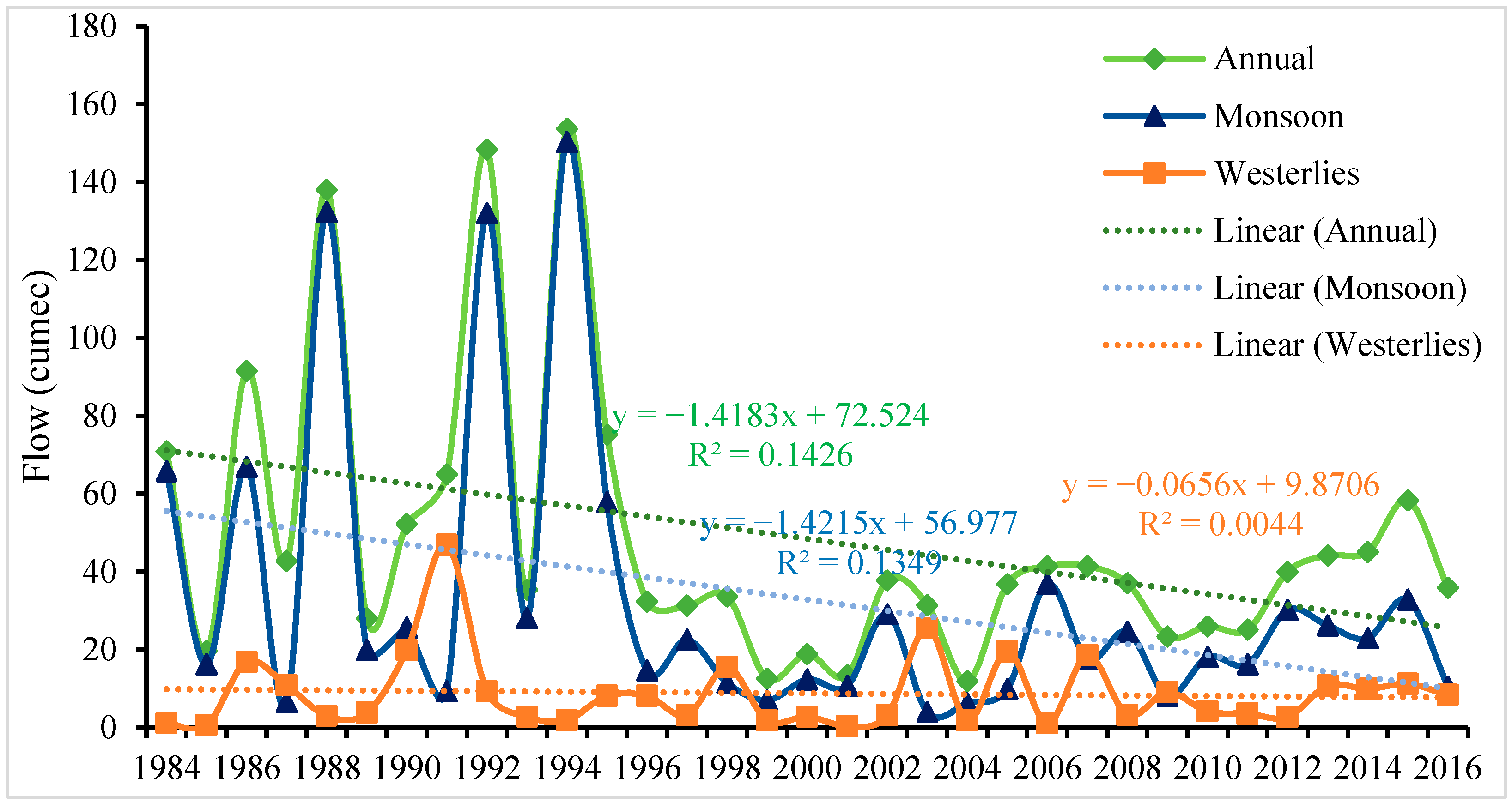 Figure 10b), which explains the majority of the high-flow years on record. At first, there were several sharp peaks, but by the late 1990s, monsoon flows had declined. The downward trend indicates a steady drop in monsoon-based streamflow.