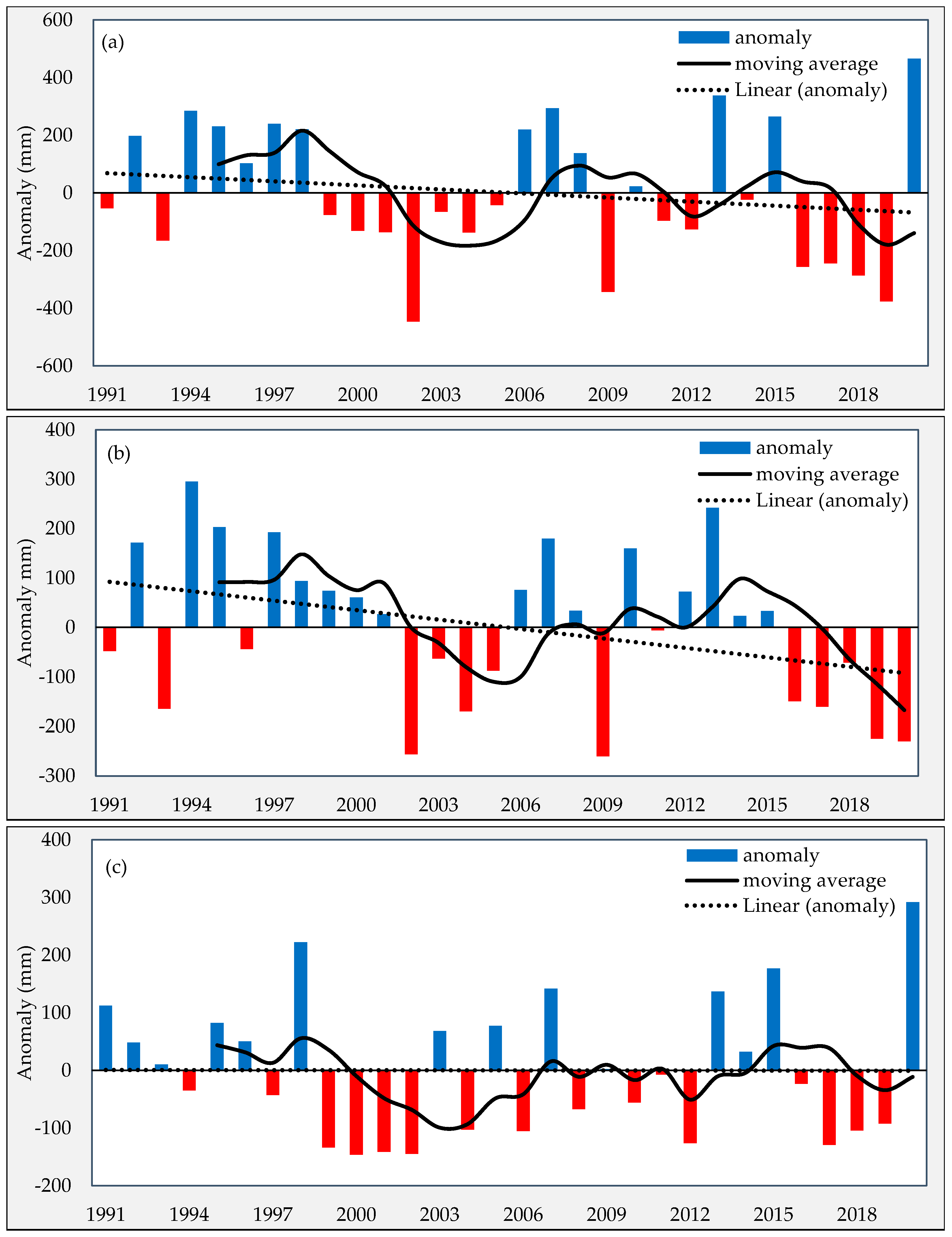 Figure 8c) precipitation in the Soan River Basin. The anomalies were calculated against the long-term mean; positive anomalies (blue bars) represent wet conditions, and negative anomalies (red bars) represent dry conditions. The solid black line shows the moving average, which indicates the variability and regime behavior of the past few years, and the dotted black line indicates the linear direction of the precipitation anomaly over the period of study.