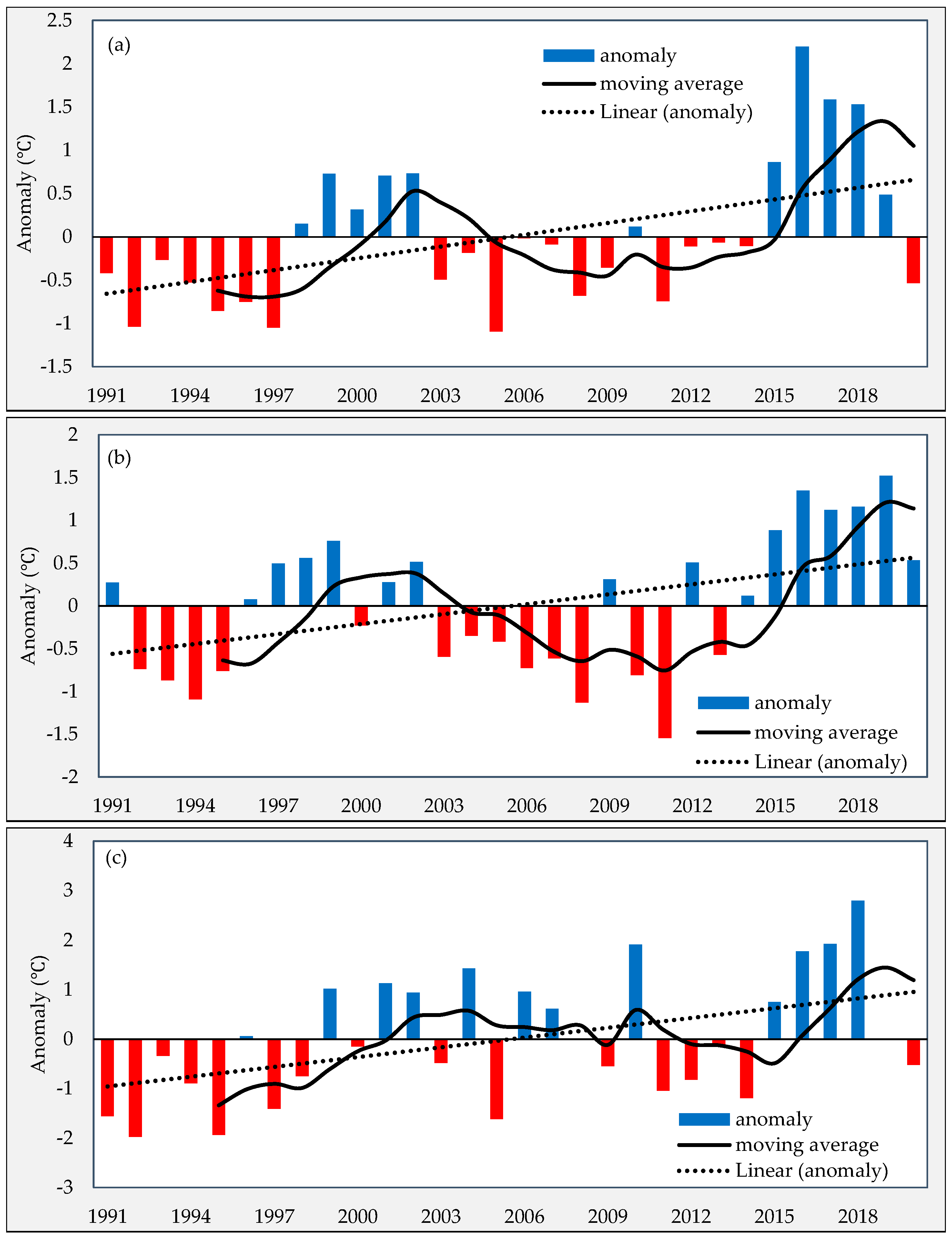 Figure 9c). Temperature anomalies were calculated against the long-term mean, with blue bars representing warmer-than-average years and red bars indicating cooler-than-average years. The solid black line represents the moving average, which illustrates the multi-year variation in the temperature, whereas the dotted black line is the trend in the temperature variations over the time of study.