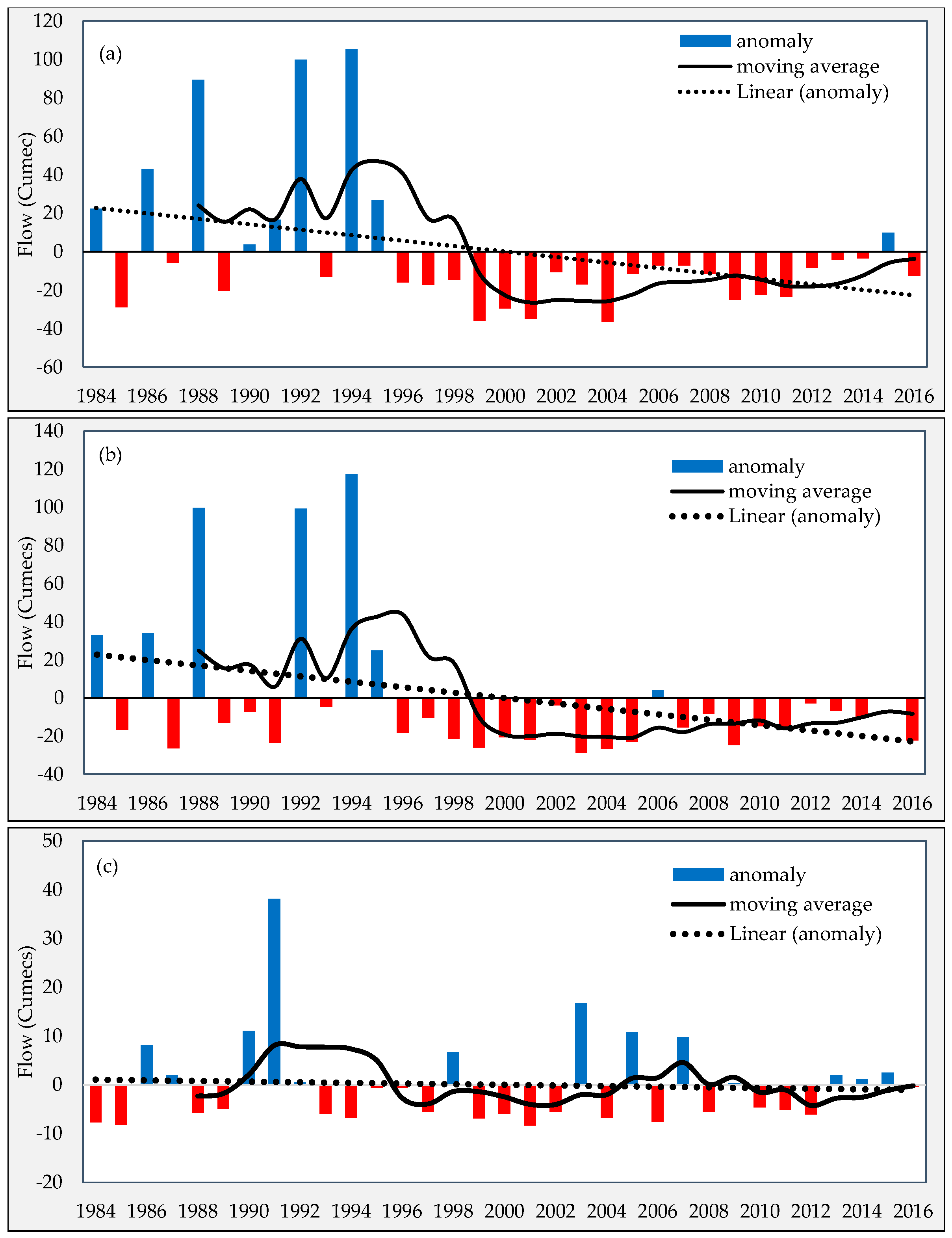Figure 10c) streamflow in the Soan River Basin from 1984 to 2016, together with the moving averages and the linear trend lines. These plots indicate that there are high interannual changes in the annual and seasonal streamflows, with distinct differences between the initial and later sections of the record.