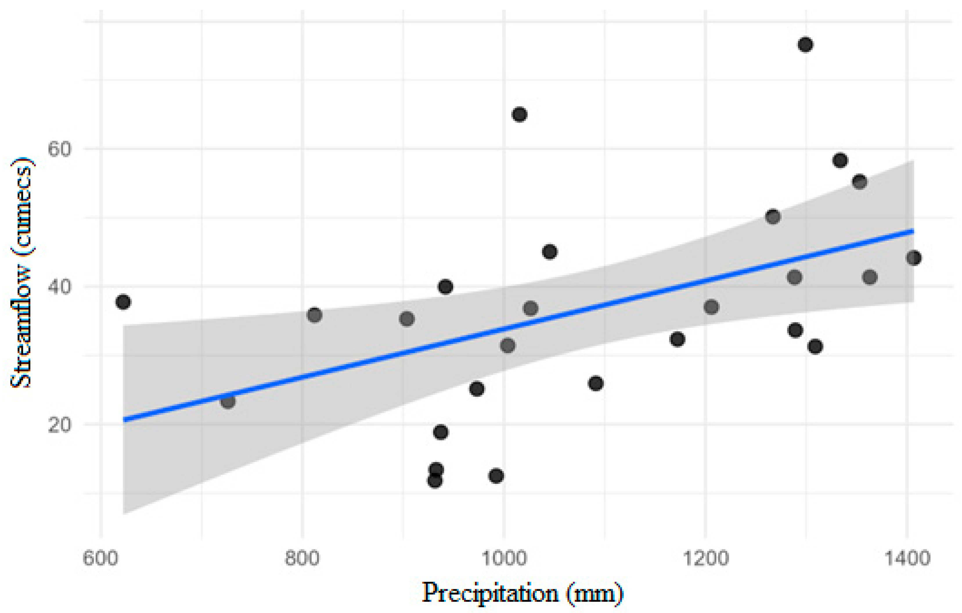 Figure 11 shows the relationship between the annual precipitation and streamflow in the Soan River Basin. The scatter plot indicates that there is a positive correlation between precipitation and streamflow, as demonstrated by the positive regression line. The Pearson correlation coefficient (cc = 0.48) indicates a moderately positive association that was statistically significant (