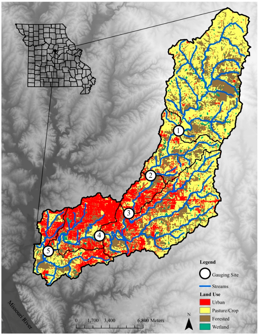 Current understanding of the relative impacts of land use on stream temperature regimes has advanced in recent years [15,16,17,18,19]. However, it has also been noted repeatedly that the effects of natural and anthropogenic forces on Tw are highly complex and geographically distinct, and thus in need of further investigation, particularly in urban environments where management and sustainability of aquatic ecosystem health and water quality is of particular concern [1]. Therefore, the objectives of the current work were to investigate: (a) the effects of urban runoff on acute increases in Tw and (b) the effects of urban land use on Tw as discharge increases using three water years of data collected from five gauging sites located in a mixed-land use urbanizing watershed of the central US.