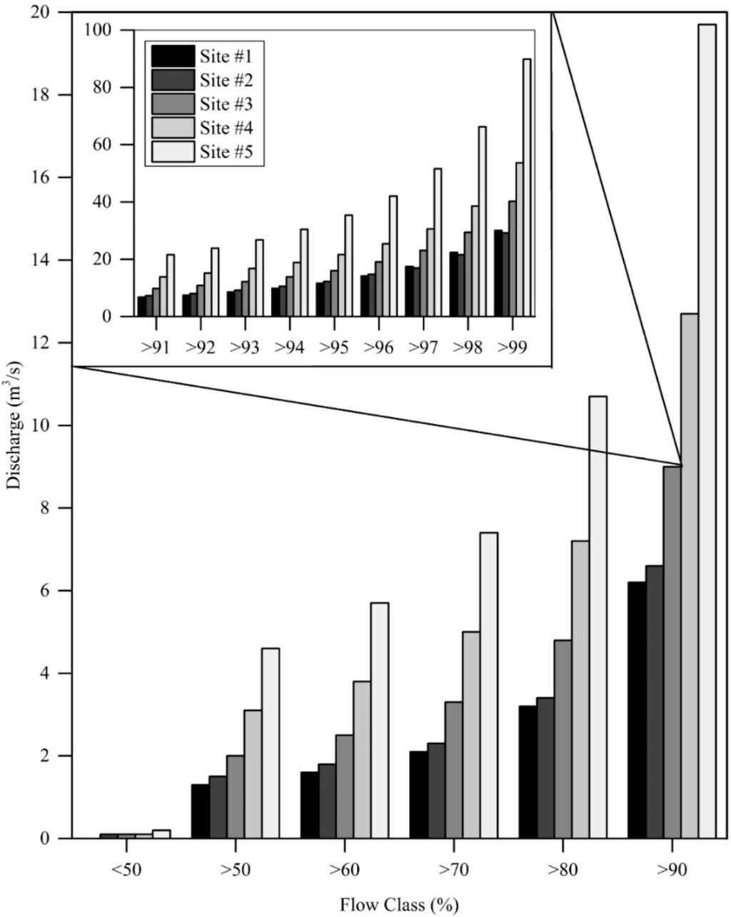 Mean discharge above and below median values for each gauging site (WY 2011 to 2012) in Hinkson Creek Watershed, USA. The nested plot expands the >90% flow class for a total of 15 flow classes.