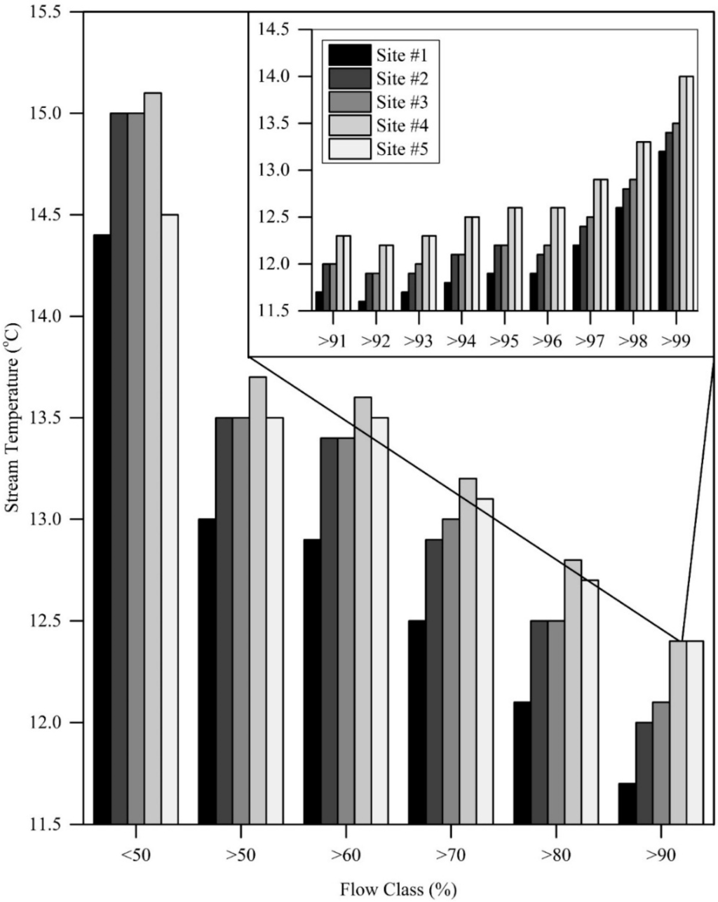 Mean stream water temperatures above and below median values for each gauging site (WY 2011 to 2012) in Hinkson Creek Watershed, USA. The nested plot expands the >90% flow class for a total of 15 flow classes.