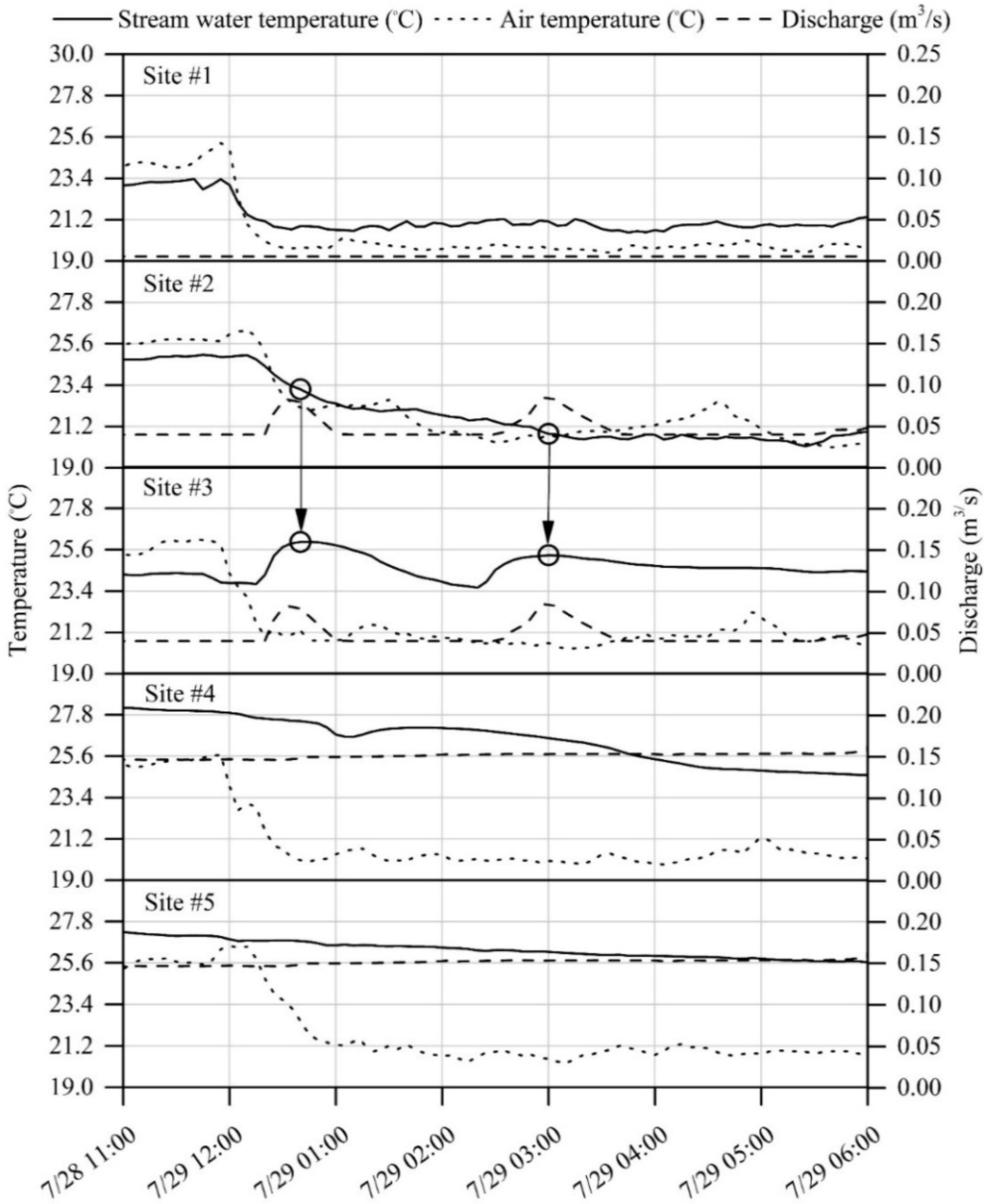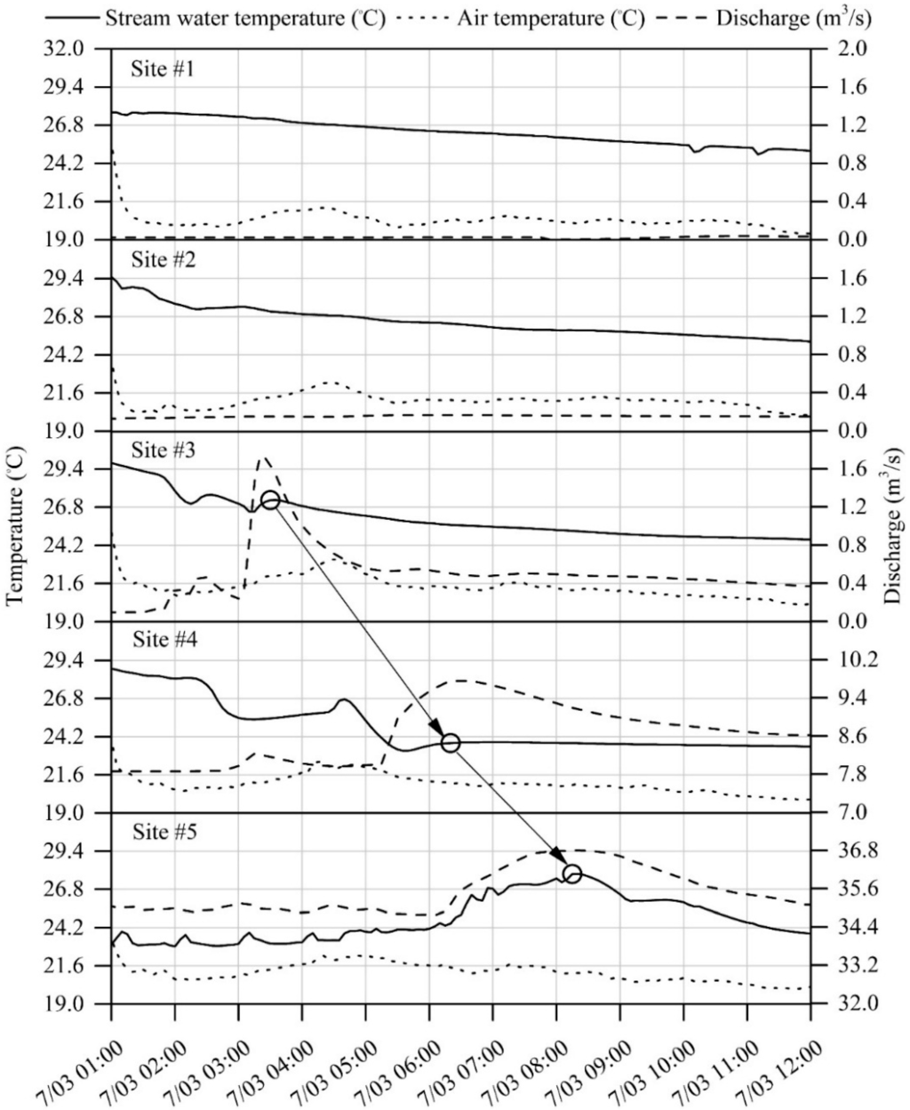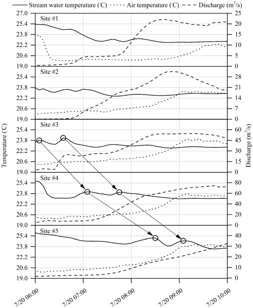 Stream water temperature surges sensed at gauging sites in Hinkson Creek following a summer thunderstorm near sunset during summer 2011. The black circles mark the peak Tw surges and the arrows track the Tw surges downstream from sites #3 through #5.