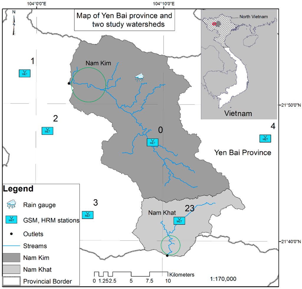 Study site of the Nam Kim and Nam Khat watersheds. GSM, global spectral model; HRM, high resolution model.