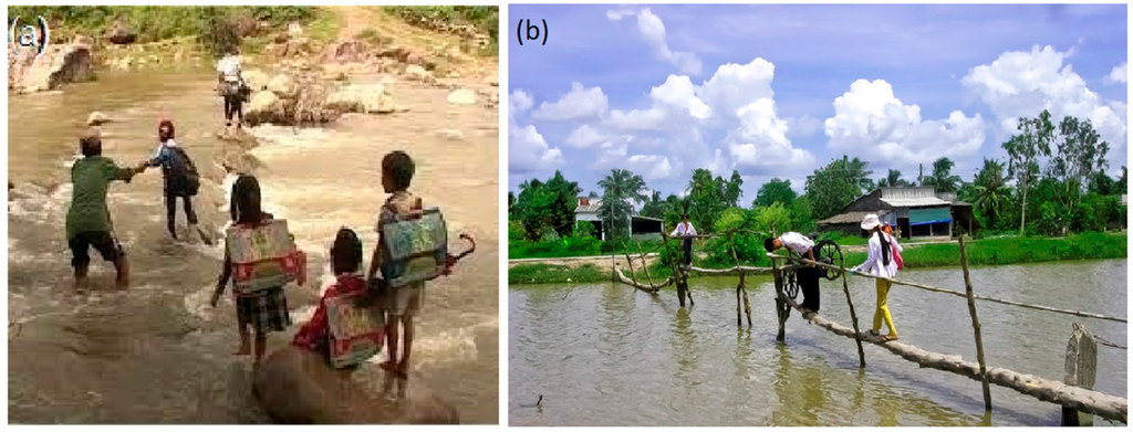 Pupils crossing the river on their way to the school (a) and a typical footbridge (b) in rural areas in Vietnam (source: http://tuyensinh.nld.com.vn and http://kienthuc.net.vn, respectively).