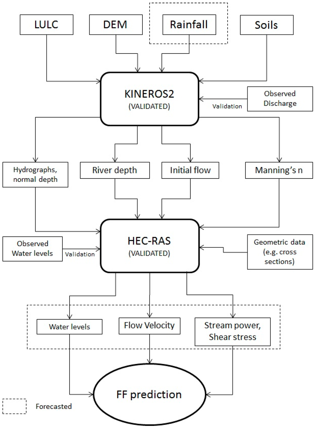 The study framework was designed to accomplish the study objective, as shown in Figure 3. It is important to note that the forecast rainfall by means of the KNIEROS2 model [,] will produce the forecast river hydrographs, depth and initial flow, which will be used as inputs for the HEC-RAS and generate the forecast water levels or stages (WLs), flow velocity (FV) and energy curves for the FF forecast strategy.