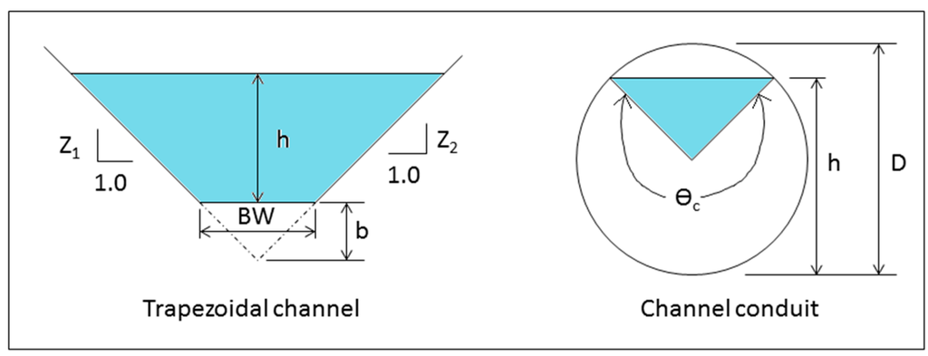 The hydraulic depth is estimated in KINEROS2 by approximating the channel cross-sections as trapezoidal or circular, as shown in Figure 4 and in the flowing equation: