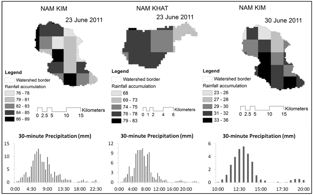 We also used gauged rainfall recorded every three hours on 8 July (R8th) and 30 to 31 (R31st) July 2011 by the rain gauge established at Nam Kim (Figure 1) for validations of the models. The development of the rain is represented in the section 4.1.1.
