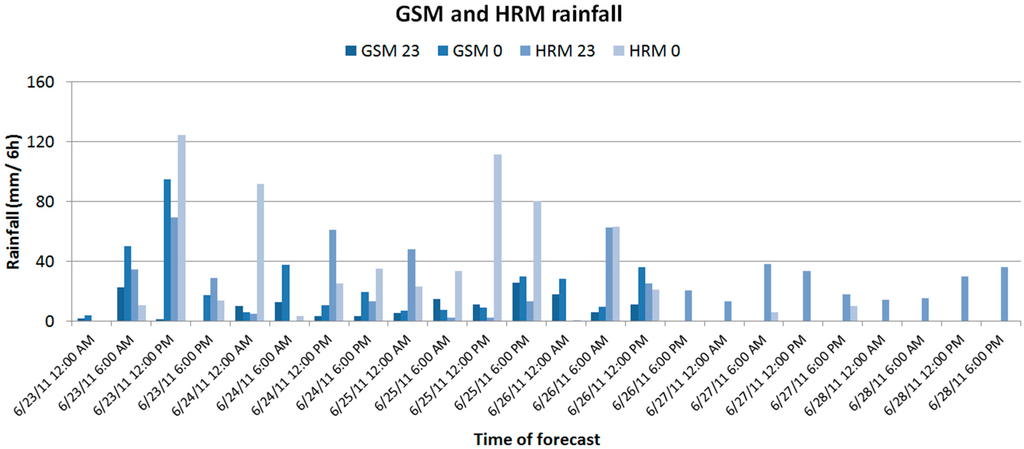 The 6-h, accumulated rainfall of GSM (84-h forecast) and HRM (132-h forecast) was the forecasted observation at 00:00 on 23 June 2011 (Figure 6) at Stations 0 and 23 (locations shown in the study site figure). Both of the models have the ability to operate at large, meso- and small (grid) scales and take about 50 min for each operation. The GSM was operating four times a day at 00:00, 06:00, 08:00 and 12:00, and the HRM was operating at 00:00 and at 12:00.