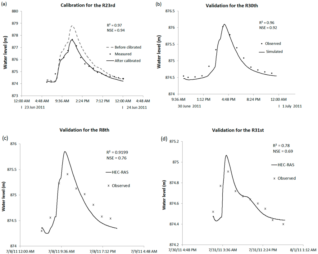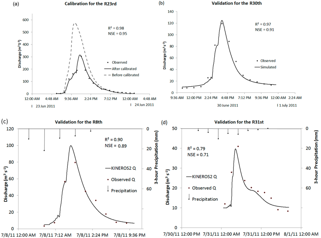 KINEROS2 and HEC-RAS calibrations for Nam Kim were made for the rain event on 23 June 2011 (R23rd) using observed discharge and water levels from each model respectively. In these stages, the hydraulic conductivity (Ksat) and relative saturation index (S) were adjusted for the KINEROS2, and Manning’ n coefficient (N) was altered for the HEC-RAS calibration.