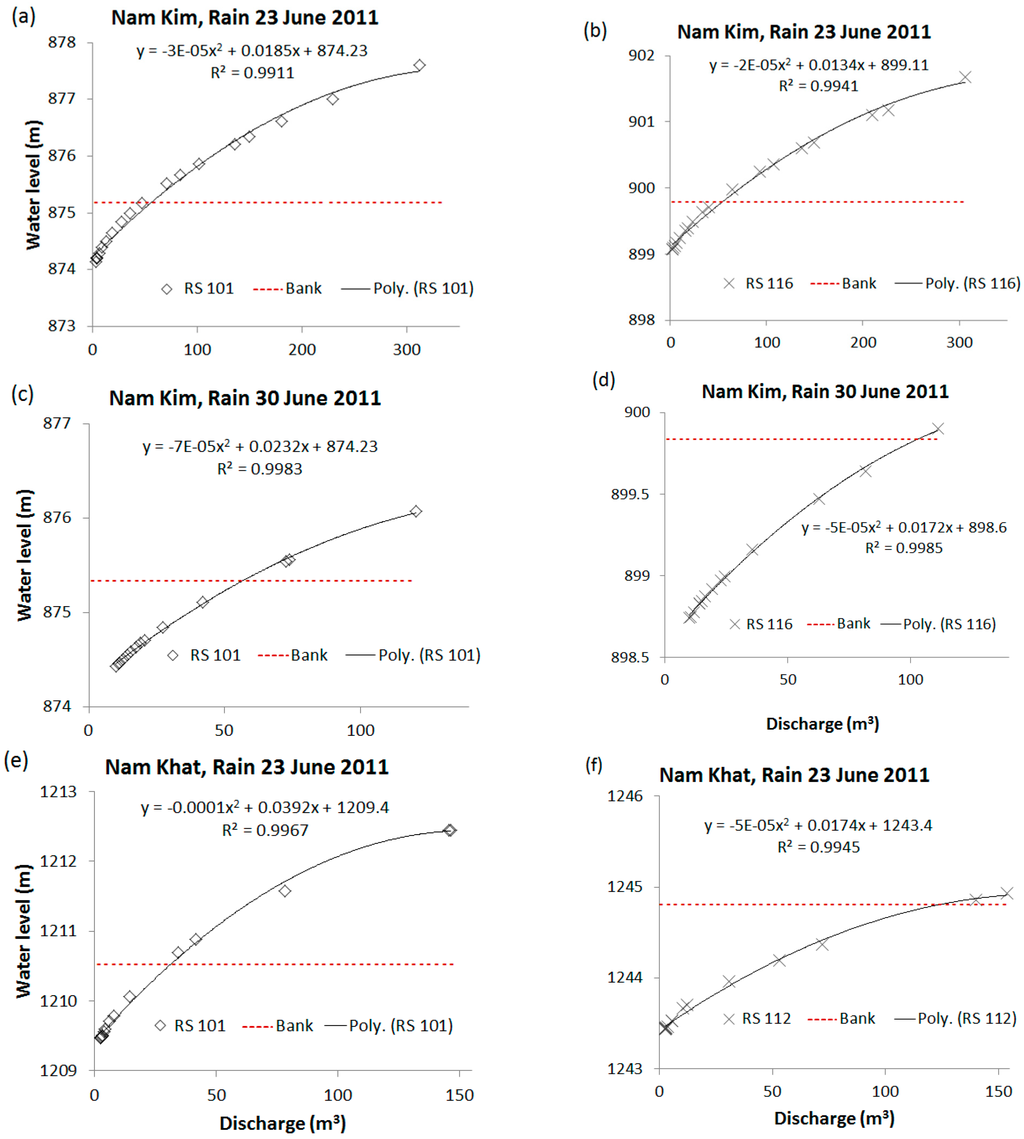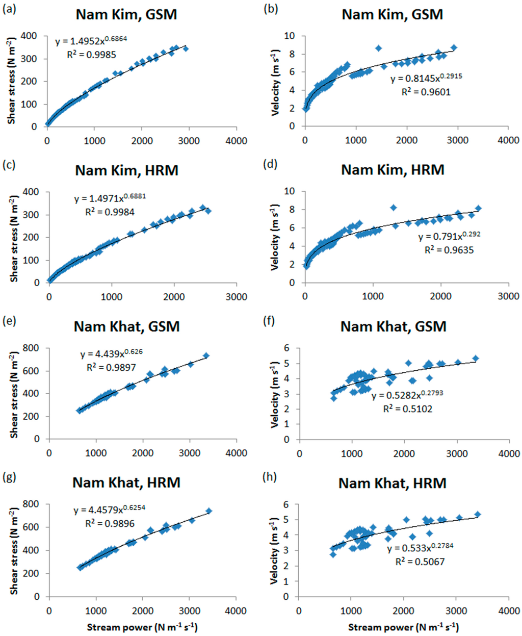 The total streamflow, shearing forces and velocity at individual RS (including interpolated RSs) were forecasted for 3.5 and 5.5 days using GSM and HRM rainfall, respectively, and the starting time of the forecast was at 6:00 on 23 June 2011. Furthermore, their relationships were presented by the power curves, equations and the regression squared values (R2) (Figure 12). The shearing power varied greatly from 10 to 350 in Nam Kim using GSM precipitation (the peaks were a little lower compared to using HRM) and from about 220 to 750 N·m−2 in Nam Khat (for both GSM and HRM). Similarly, the flows were very powerful (ranging from 50 to 2500 in Nam Kim, from 650 to 3400 N·m−1·s−1), and there was not much difference between using GSM and HRM rainfall. The interesting point is that the strong correlations between streamflow power and shearing force were explicitly shown for all of the cases (all R2 ≈ 0.99; Figure 12a,c,e,g).