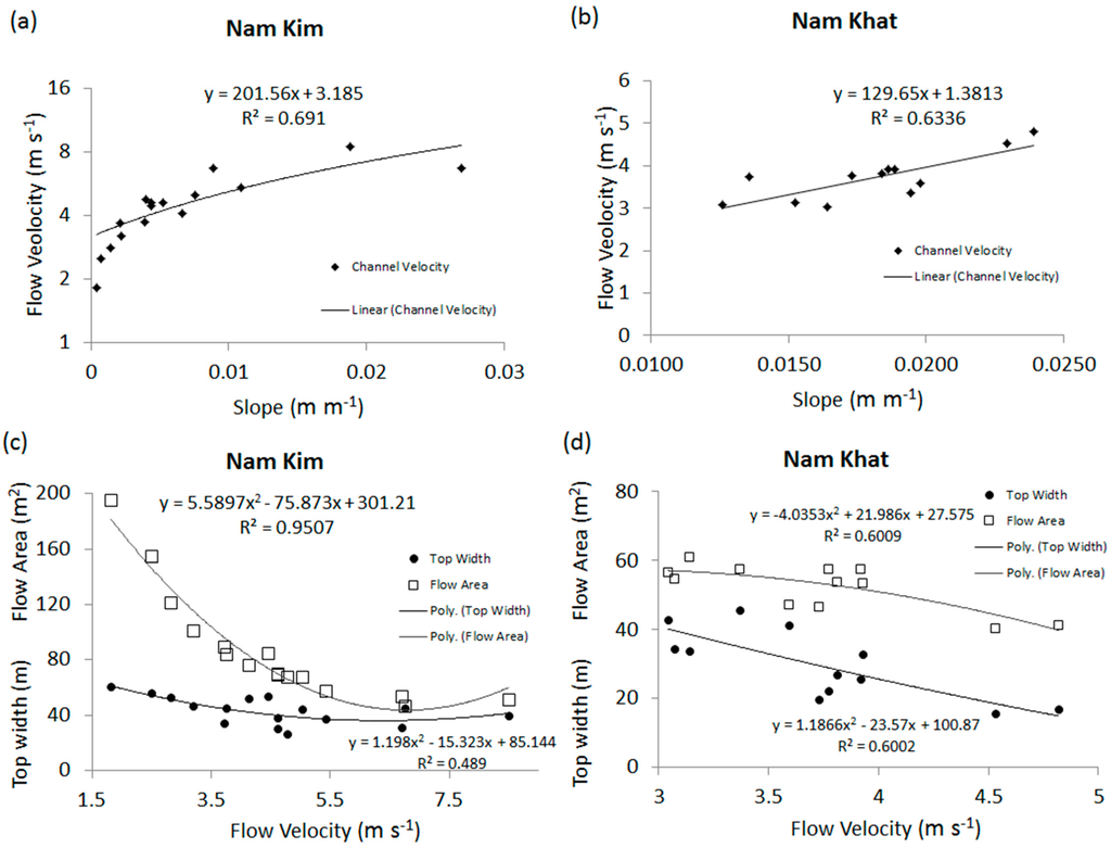 We also found close relationships between river geometry (slope, top width and flow area) and hydrological responses and between those of hydraulic behavior (velocity, streamflow power and shearing forces). From the result analyses, we found reasonable outcomes for the ungauged watershed of Nam Khat using the so-called traditional concept of spatial proximity invented by []. This is meaningful for the enlargement of this approach to other poorly-gauged and ungauged watersheds in North Vietnam. Especially, FFs could occur in any watershed from small to large, even in subwatersheds, and usually, not all watersheds are gauged. This approach of proximity was supported by some similar studies of Makungo et al. [], Servat and Dezetter [] and Boughton and Chiew [].