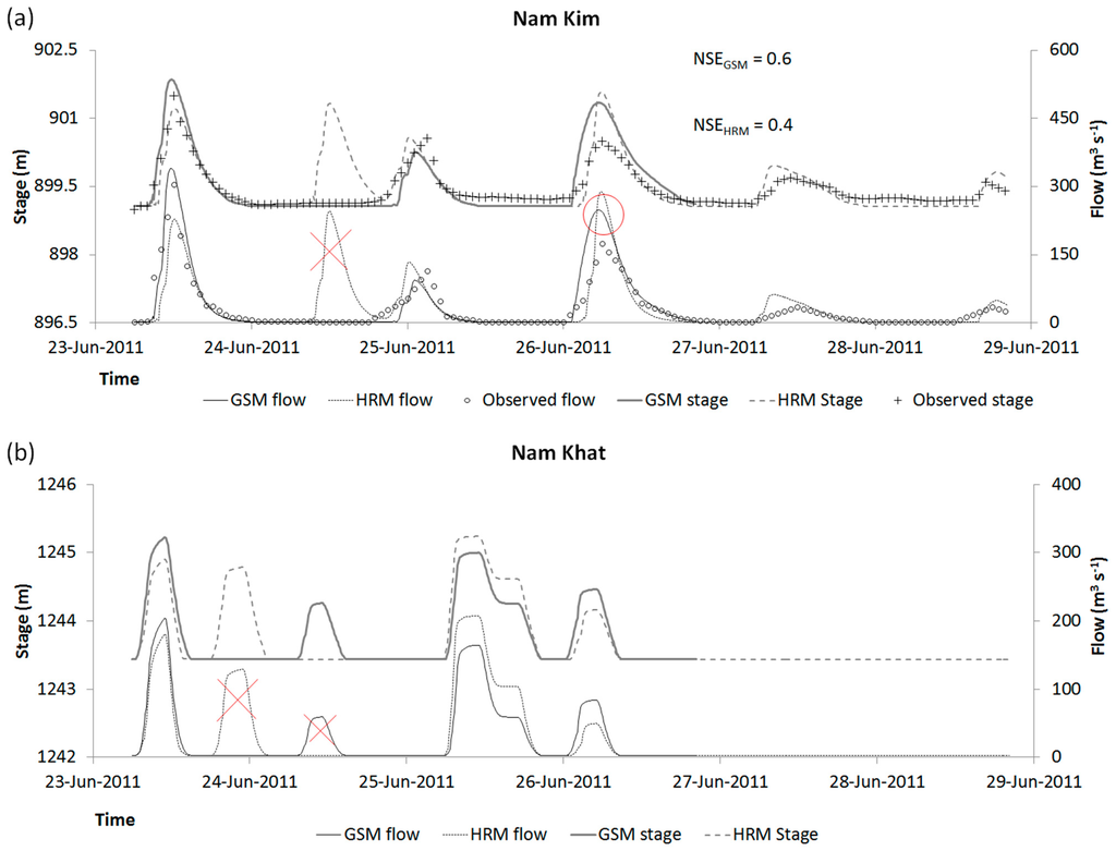 Figure 11 provides the intercorrelations between the HEC-RAS discharge and stage fluctuations during the forecast time (3.5 and 5.5 days by GSM and HRM) in the Nam Kim (top graph) and in the Nam Khat (lower graph) channels at the outlets (RS101). The remarkable features were that the forecast Q and WL of the first rain (starting at 6 a.m. on 23 June 2011) corresponded well with hydrological gauged data, changing in WL proportionally well with the changes of flow values and the wrong predictions (marked by the red crosses and identified by means of a comparison with observed data in Nam Kim and the differences between GSM and HRM stage and flow in Nam Khat). Interestingly, when we compare the peaks of the two graphs, those of Nam Khat were intuitively not very natural (less smooth than expected) compared to the peaks of Nam Kim. This could be explained by the coarse temporal resolution of the forecast precipitation (6 h), which had stronger impacts on the predicted Q and WL in the smaller watershed of Nam Khat than in the bigger one of Nam Kim. When it comes to FF prediction, the question of hydrological and meteorological uncertainty is well known and has often been discussed []. The agreements between the GSM- and HRM-based flows presented in Figure 11a were illustrated using the Nash–Sutcliffe efficiency (NSE) [] for the predicted discharge of GSM and HRM rainfalls, which were 0.6 and 0.4, respectively. Based on the NSEs, using GSM precipitation appeared to perform better compared to using HRM, though satisfactory performances were observed for the first rain on 23 June 2011. On the other hand, there were some differences between forecasts and measured data for both cases on 26 June 2011 (red circle). In addition, by comparing the different uses of forecast rainfall, some false alarms and missing forecast (red crosses) likely could be seen on the graph. However, it is still difficult to conclude whether the uncertainties came from the hydrological models or from the rainfall models. We might need more calibrations for both rainfall models. The estimate accuracy could greatly benefit from rainfall data of higher quality []; possibly, rainfall from newer radar generations would be a good option. Unfortunately, there was no available on-site measured discharge and stage data for testing the forecast flow and stage for the Nam Khat reach.