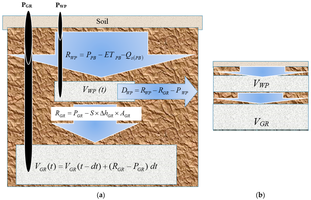 Change in storage in GR (ΔSGR) can be written as of Equation (7). The term ΔhGR [L] represents drawdown of GR and AGR is surface area of GR.