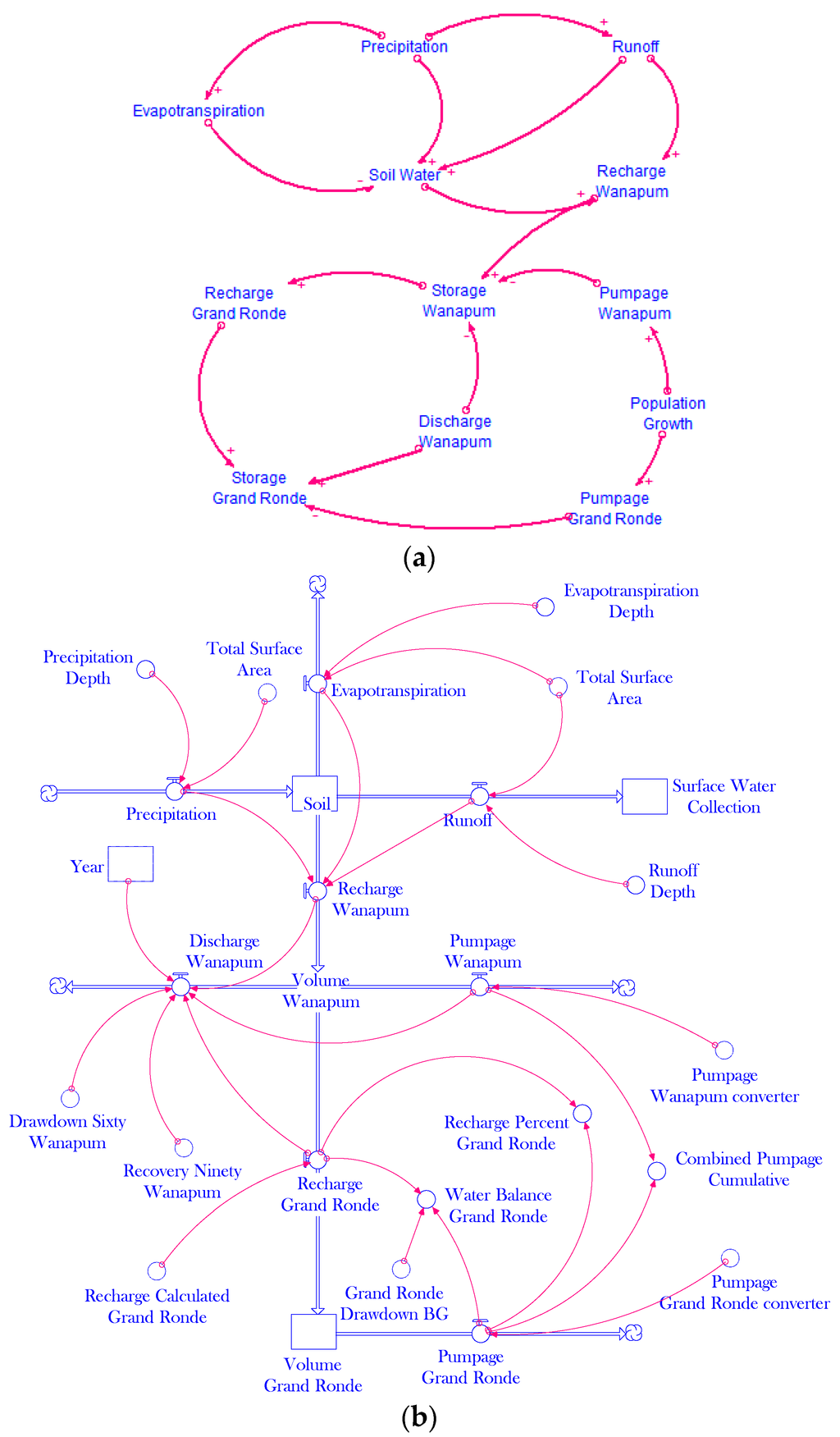 Figure 3a shows the causal loop diagram of the Palouse basin watershed in its simplest form. An increase in precipitation will increase recharge to WP and GR. Increased population in PB would put pressure to both WP and GR which will ultimately reduce the storage of aquifers by further increasing the drawdown.