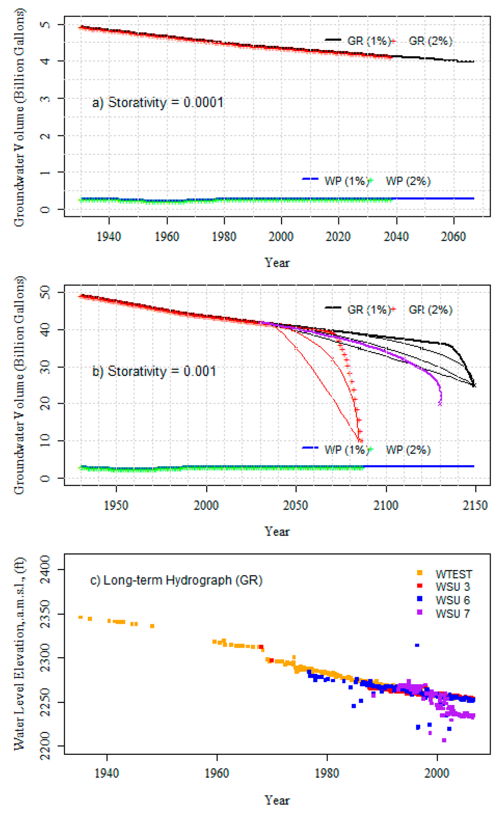 One of the frequently raised questions while managing the groundwater is the aquifer storage capacity and possible life of the aquifers. However, the larger uncertainty in storativity and hydrogeology can put these topics in shadow and the usefulness of these simple models can also be questioned. The estimated total initial volume of the WP and GR is about 0.3 billion gallons (surface area about 82 km2) and about 5 billion gallons (surface area of 728 km2), respectively, when potential drawdown at the bottom of the aquifers with storativity of 10−4 (Table 4). This total volume of groundwater in the WP and GR represents the maximum water in the aquifers irrespective to the present water level. The average maximum potential drawdown of the Moscow WP is about 137 m, Moscow GR is 271 m and Pullman GR is 305 m at the bottom of aquifers. Now, coming back to the original question if these estimated aquifer storage capacity is reasonable, while comparing the actual water extraction. Water extraction from these aquifers far outreaches the estimated storage capacity or our understanding to storativity and recharge needs extensive revisiting.