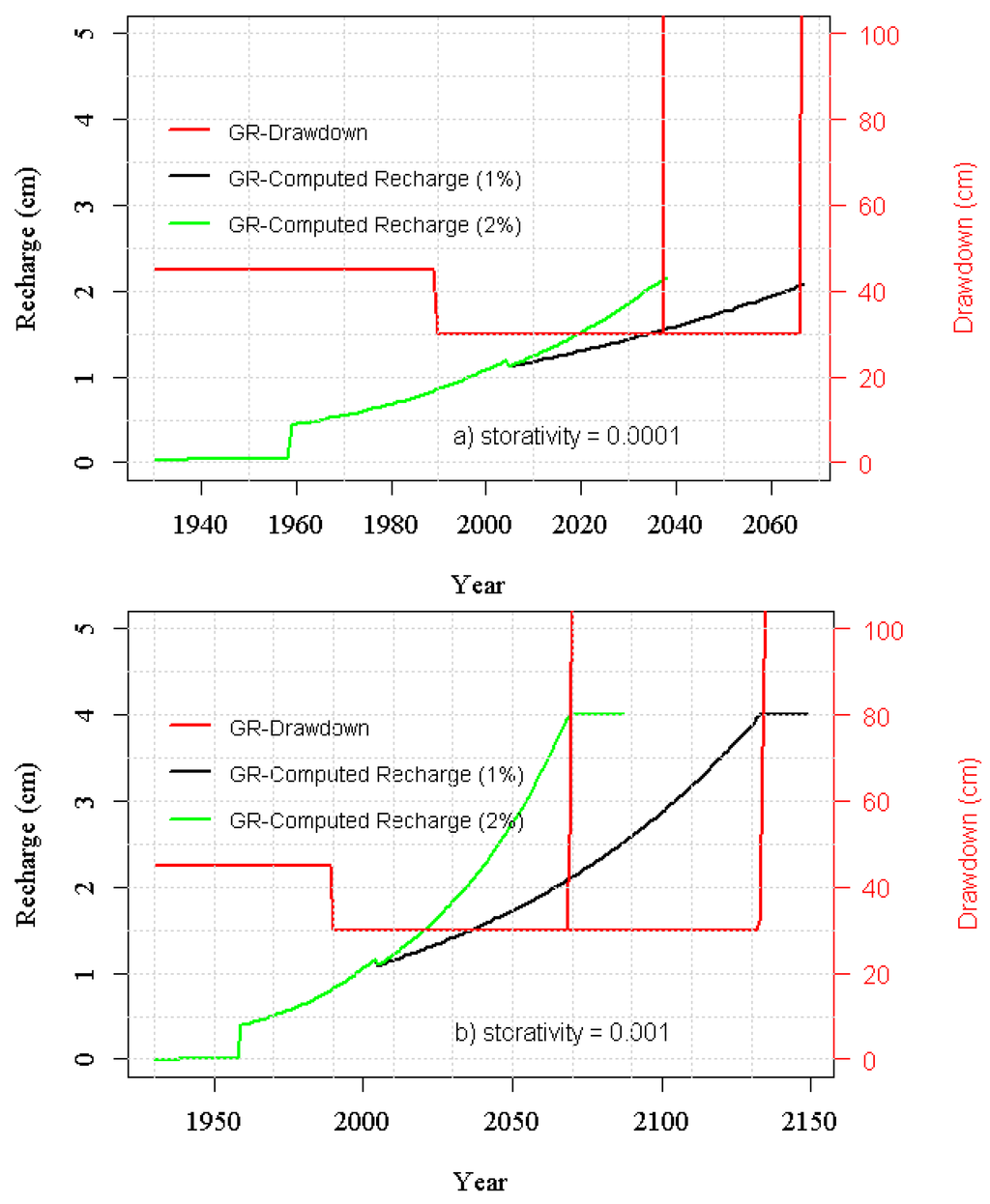 Recharge to GR can be computed simplifying Equations (6) and (7) (Equation (8)). With this assumption, any discrepancy in estimation of storativity or surface area of GR can affect the overall accuracy of the estimated recharge. Similar approach (Equation (8)) had been utilized to test how the system parameters affect the recharge estimates in GR [61,62]. The maximum recharge to GR (RGR (max)) is limited to 4 cm/year not to surpass the recharge from water balance.