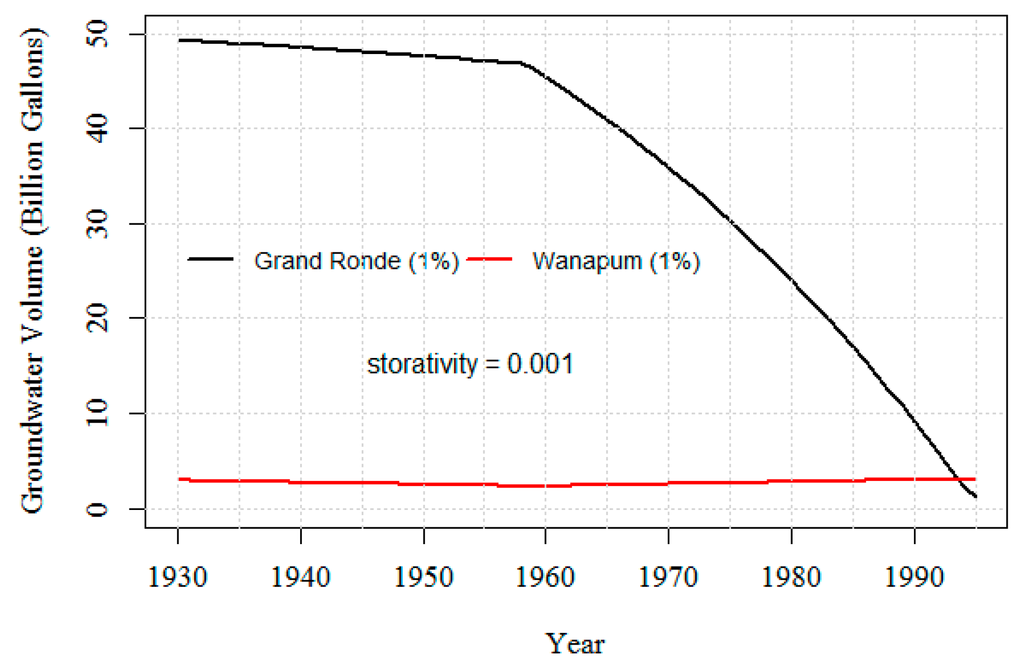 The question of the storativity of the basaltic rock of PB aquifer and Columbia basin is a particular interest of geologist, water managers and hydrologist. The two closely located state universities of Idaho and Washington along with other entities are working to better understand the aquifer properties and hydrogeology of the basin. Studies show that storativity of PB aquifer basalt ranges approximately between 10−3 and 10−5 based on aquifer discharge tests [60], 1.5 × 10−4 ± 0.2 × 10−4 [61], 3 × 10−5 to 3 × 10−4 of GR [62] and 0.67 × 10−3 of WP [63]. Moran [62] had compiled the storativity estimates from previous PB investigations. Even though the storativity values of the aquifer are vital because it governs the initial volume and overall life of aquifers, recharge to the aquifers plays a critical role. The short term drawdown and recovery (1930–1990) of WP indicates that recharge was the prevailing factor of the dynamics of WP. The aquifer recharging process can be less evident in GR because of the larger surface area, complex hydrology, and hydraulic and hydrologic connectivity among the other groundwater regions, but the inconsistency between the drawdown and extraction is indicating that GR might be actively recharging. Analyzing initial volume of aquifers, the current decline rate the aquifer and the long term pumpage, we utilized the storativity value of 10−3–10−4 [61] for the modeling purposes. Smaller storativity values imply less water stored in the specific saturated depth of aquifer as well as only a little amount of water that can be extracted from drawdown.