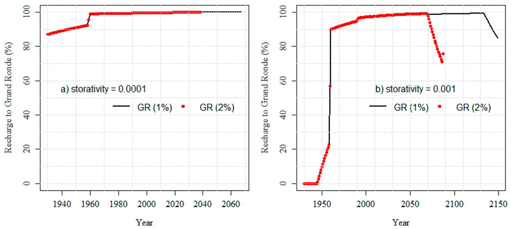 In a separate simulation, we tested a hypothesis of no recharge to GR which makes the GR as a sole function of GR pumpage (Figure 6). If assumed no recharge to GR, water extraction from GR should be equal to drawdown of GR. Without an acceptable storativity value, we can argue the fruitfulness of this simulation, but it will help to distinguish the role of recharge. Simulation result shows that entire groundwater from GR should have been emptied in around the 2000s (with higher storativity 0.001, Figure 6), with the current applied drawdown (0.3 m/year) and 1% population growth. Analyzing this scenario, we attempted to increase life of GR by increasing surface area of GR assuming identical to the entire PB (2044 km2). This attempt does not help to increase the life of the GR because of the lack of continuous source to replenish the pumpage. This probably implies that a significant amount of water might be entering as recharge to GR to balance the deficit. In a recent study, Piersol and Sprenke [61] indicated that about 93.5% ± 2.6% of water in GR is contributed by the recharge which agrees the finding this study (Figure 7).