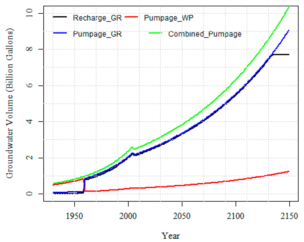 Figure 8 shows the comparison among the different pumping entities and recharge to GR. The GR pumpage closely followed to the recharge to GR. It is because of the dependence of pumpage to recharge and it this will increase in the future as the demand increases. At the end of the simulation period i.e., at 2150, the demand of PB (combined WP and GR) will be about 10 billion gallons (1% growth).
