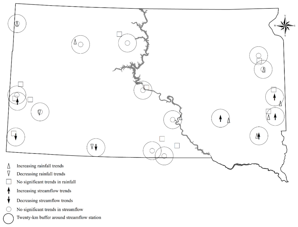 Long-term data from 18 streamflow and 21 rainfall observation stations were analyzed for trends using a modified Mann-Kendall test. Impacts of climate variability and land use change (i.e., grassland) on streamflow were also examined using streamflow elasticity concept. Results from the trend analysis showed that annual streamflow exhibited significant upward trends in 39% of the studied streams, of which 28% are in the east and 11% are in the west. The remaining 61% streams showed increasing trends (50%) and significant decreasing trends (11%). The increasing trends were more significant in moderate flow conditions (i.e., median daily and daily average flows) compared to low flow and high flow conditions. There were significant increasing trends in 39% for daily average flow and 56% of the streams for median daily flow. Low flows (one-day minimum flow and seven-day minimum flow) showed significant upward trends in 50% of the studied streams, suggesting increasing baseflow in the state. The number of streams with significant increasing trends was less for high flow conditions (28% in one-day maximum flow; 34% in seven-day maximum flow). Analysis of seasonal flows showed 56% of streams with significant upward trends in fall and 62% in winter. Less than 35% of the studied streams showed significant upward trends in spring and summer (23% and 34%, respectively). Most of the stations with significant increasing trends were clustered in eastern SD for all flow conditions (i.e., annual, low, moderate, and high flow conditions).