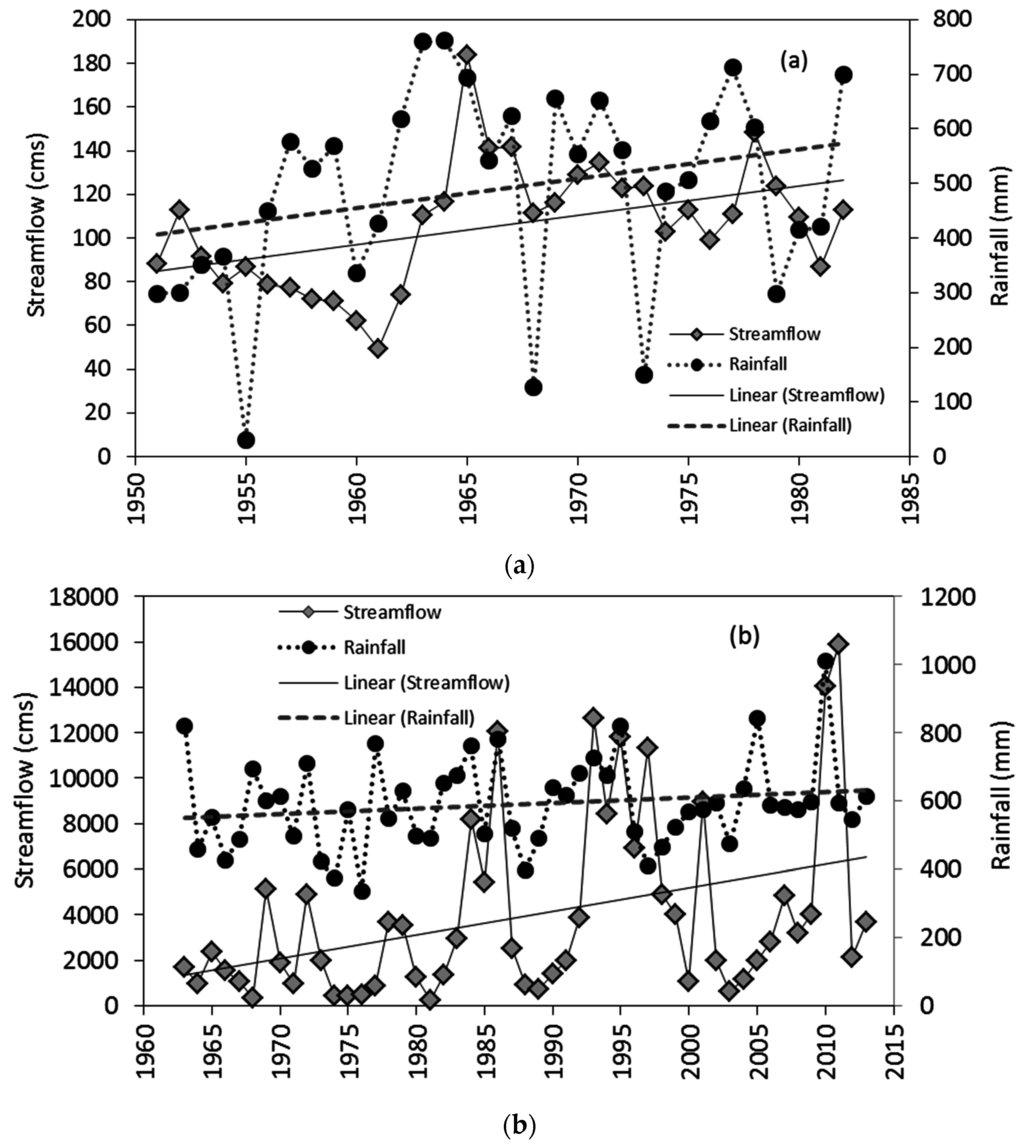 b is the median for all possible combinations of pairs of any two data points in the entire dataset. Xj and Xk are the sequential data points, where k < j. A Microsoft Excel tool developed by Salmi et al. [58] was used to estimate streamflow and rainfall trend magnitudes in this study.
