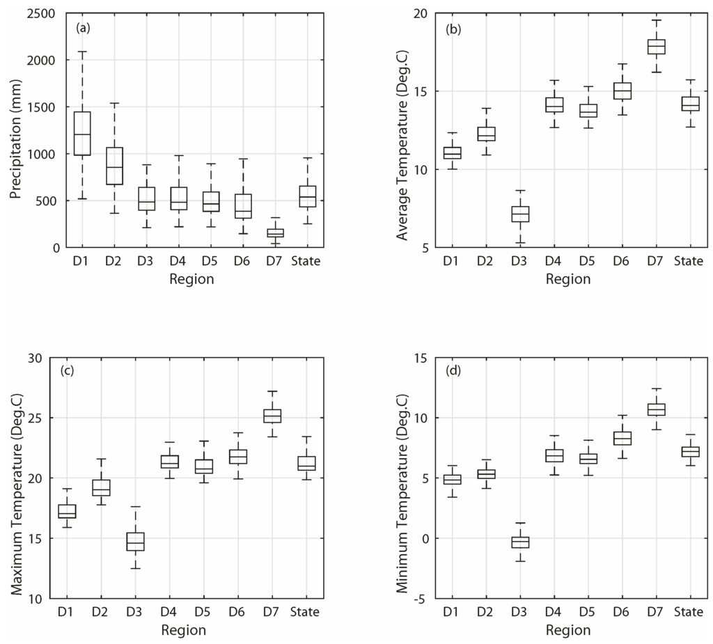 These regions have contrasting hydroclimatic characteristics (Table 1, Figure 2). The region Southeast Desert Basin (D7) is the driest and warmest region, with annual precipitation and average temperature ranges from 42–357 mm and from 16.2–20.0 °C, respectively. The North Coast Drainage (D1) is the wettest region, of which the annual precipitation ranges from 519–2087 mm with a mean value of 1223 mm. On average, the state receives precipitation annually at an amount of 561 mm, of which 85% (477 mm) occurs in the wet season (November–April or N-A). The coolest region is the Northeast Interior Basin (D3), of which the mean annual temperature varies from −0.3–14.6 °C. In 82 years out of the 120-year period, the minimum annual temperature of this region was below zero. The long-term mean regional annual average temperature over the state ranges from 7.2–17.9 °C, with an average value of 14.2 °C. As for the regional maximum (minimum) temperature, the range is from 14.6–25.2 °C (−0.3–10.7 °C).
