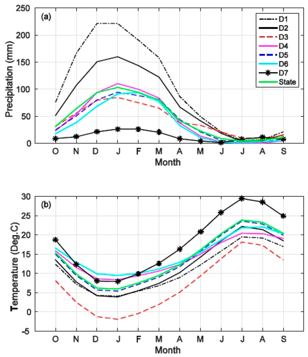 (a) Mean monthly precipitation and (b) mean monthly average temperature of the study regions for October (O), November (N), December (D), January (J), February (F), March (M), April (A), May (M), June (J), July (J), August (A), and September (S).
